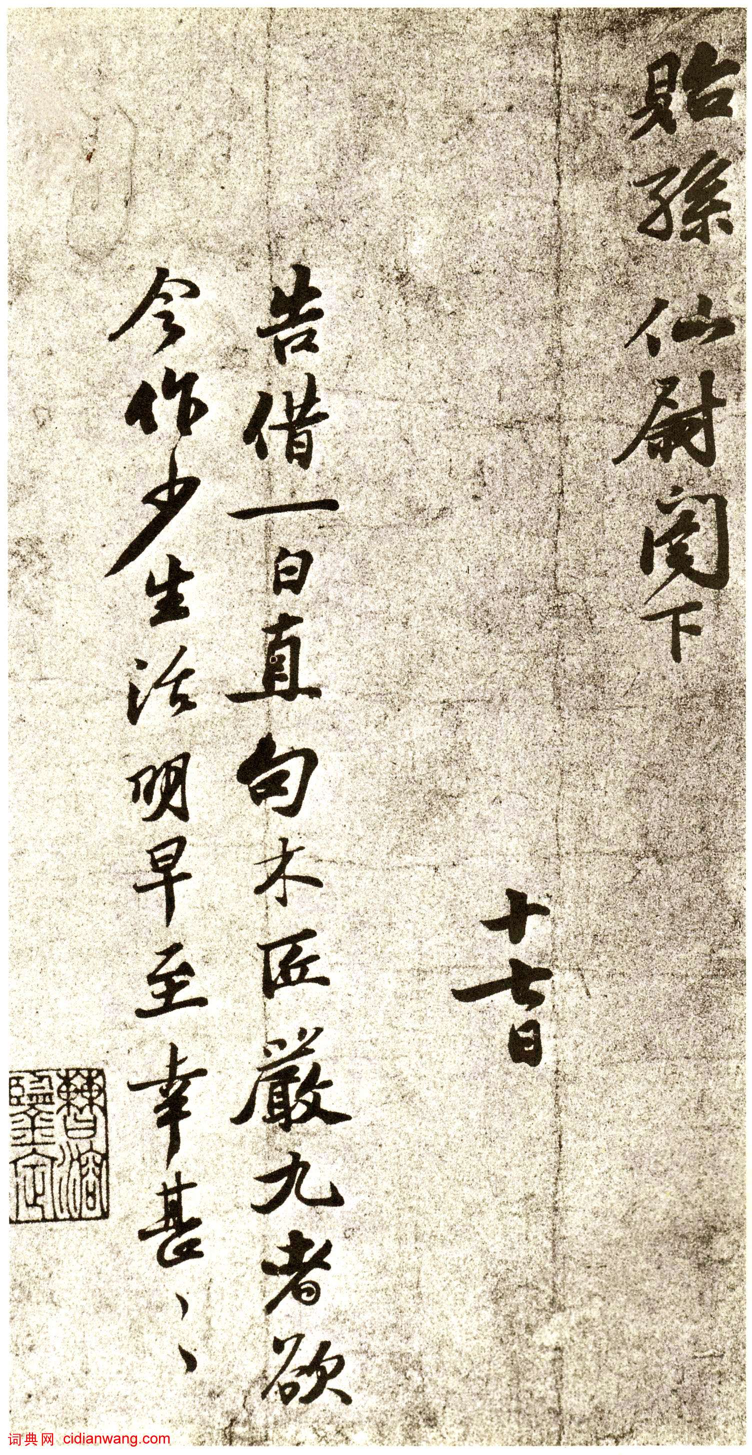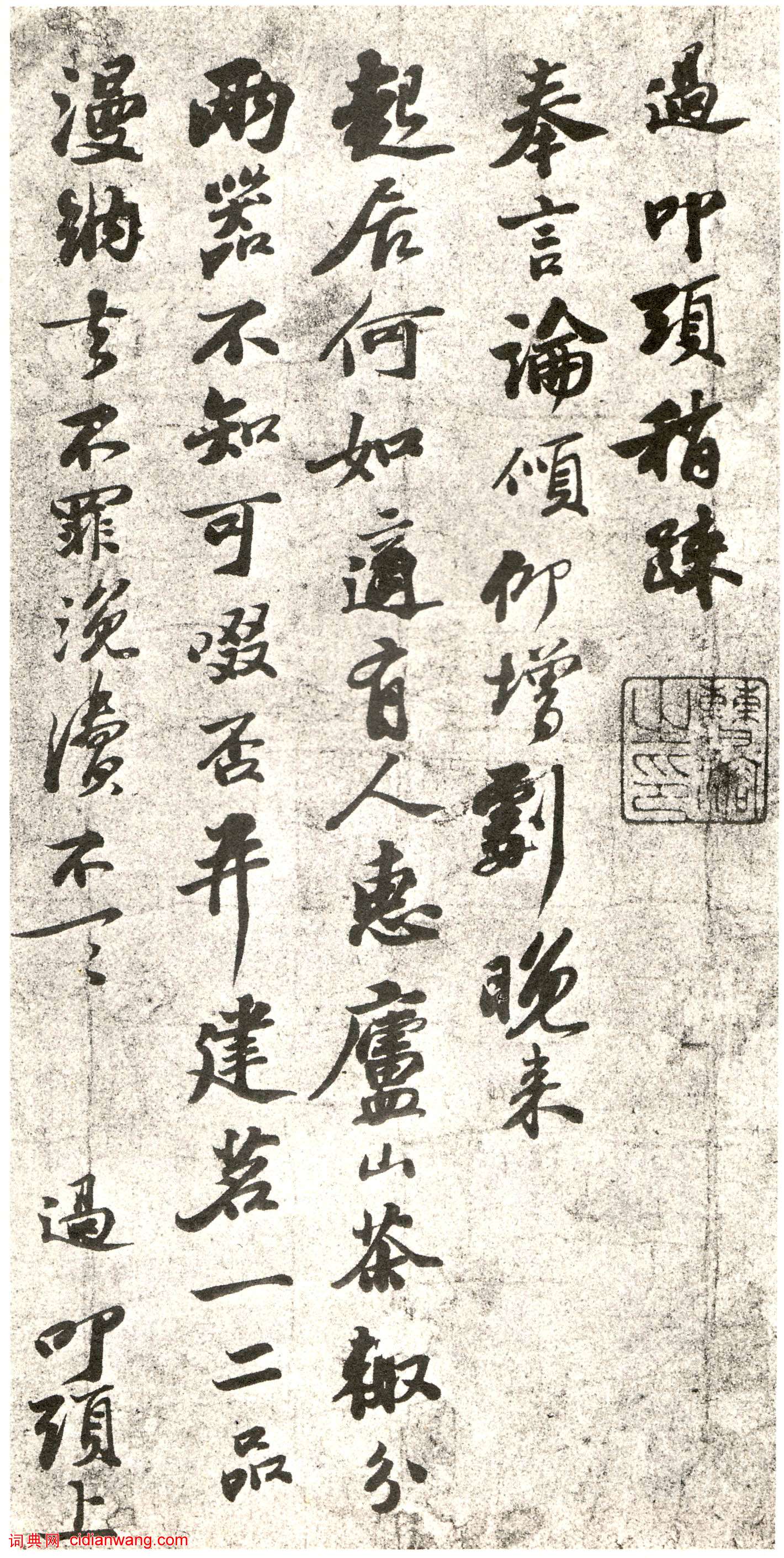 過叩頭。稍疏奉言論,傾仰增劇,晚來起居何如?適有人惠廬山茶,輒分兩器,不知可啜否?並建茗一二品,漫納去不罪,浼瀆不一一。過叩頭上。貽孫仙尉閣下。十七日。
