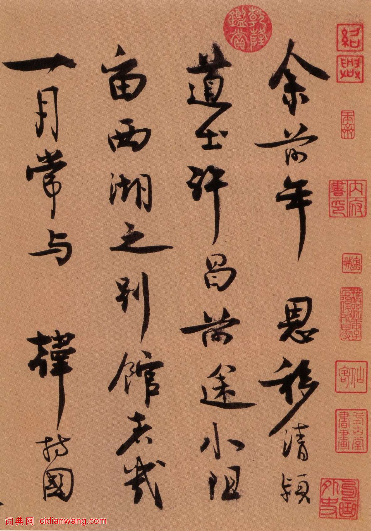 本卷分三段,首段記述了作者在去清潁途中受阻,與韓維(持國)、范鎮(景仁)泛舟於西湖嘯詠之事;中段與末段分別為三公在潁昌湖上詩作及王詵和蝶戀花詞一闕。《宋史》記載,韓維在宋哲宗剛登基時上表推薦范鎮,因為范在宋神宗時於建儲有功,於是拜范為端明殿學士兼侍讀,即文中所稱“比聞朝廷就除端明殿學士以寵之”。由此可知,該帖應書於1086年。“余前年恩移清潁”中的“前年”是指1084年。其時韓、范二人亦居於許昌,潁昌湖即文中所稱西湖,位於許昌的西北,所以,三人可以相遇於西湖游宴賦詩。該卷雖系以詩詞和友有傷感流連之意,但下筆痛快淋漓,結體緊實,筆多橫放,鋒芒畢露,獨具風貌。《吳氏書畫記》卷六將此卷誤稱為黃庭堅書,至曹溶跋方為糾正。之後,《式古堂書畫匯考》卷一二、《墨緣匯觀》續錄、《石渠寶笈續編淳化軒》、《壯陶閣書畫錄》、《三虞堂書畫目》等均改為王詵書。