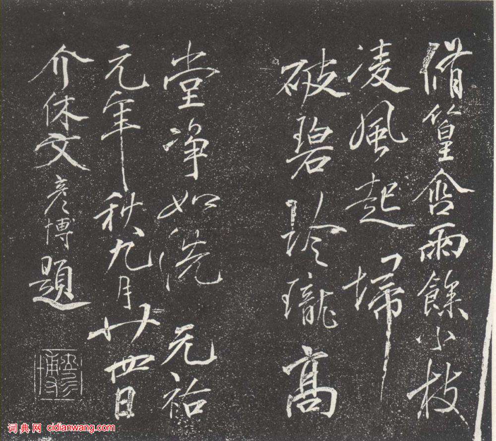 此詩帖即作於此時。詩云:“修篁含雨余,小枝凌風起。掃破碧玲瓏,高堂淨如洗。元佑元年秋九月廿四日介休文彥博題”