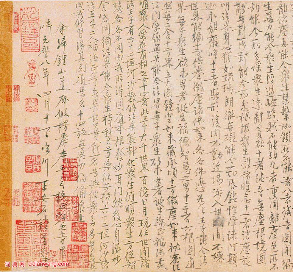 《行書楞嚴經旨要卷》為王安石去世前一年親自校正楞嚴經卷文字。自署"余歸鍾山,道原假楞嚴本,手自校正,刻之寺中,時元豐八年(1085)四月十一日臨川王安石稽首敬書"。作者時年六十五歲。卷後有南宋牟獻之,元王蒙,明項元汴、周詩題跋。曾經元陳惟寅,明項元汴、曹溶鑑藏。