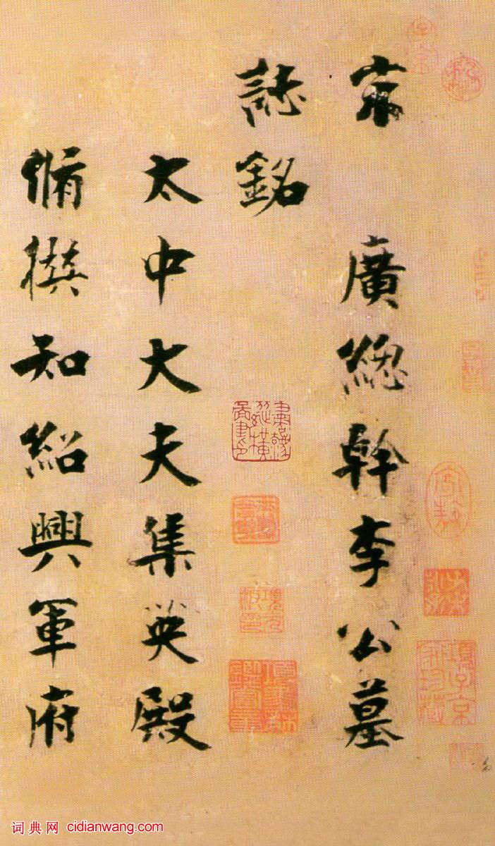 釋文:宋兩廣總幹李公墓誌銘。太中大夫集英殿修撰知紹興軍府事充兩浙東路安撫使陳顯伯題蓋。太中大夫直祕閣致仕歷陽縣開國男食邑三百戶賜紫金魚袋張即之書。朝請郎主管建康府崇禧觀邵明仲撰。余昔隸業上庠。與會稽李君伯嘉游。幾十年。暇日相過。或樽酒觴詠湖山間。見其豐儀秀整。襟度灑落。傾坐語纚纚起人意。朋友愛之。簪常盍。袂常屬也。洎余叨舍級。蒙恩解褐。與之別又十年。而聞伯嘉之疾且死。死生之變。可勝悼哉。淳祐投閑故里。一日會其猶子於制幕。氣貌絕類伯嘉。固已如見元賓矣。退而有攜刺字踵門曰友龍者。伯嘉子也。其思父不(下五字殘損)。其子焉當何如也。既逾年。友龍自越以書來曰。友龍不孝。先君之歿有年矣。幽堂之銘。未知所託。緒言履行。無以詔後。是吾沒吾父也。重不孝。惟先君之知友是望。敢以屬吾子。余惟朋友之誼。雖以文取詆。固不辭也。乃援筆而書之。君姓李氏。諱衎。伯嘉其字也。世為紹興上虞人。所居里曰五夫。五夫之李聞於越尚矣。君之曾祖。故資政殿學士贈太傅光。是為莊簡公。祖故宣義郎提舉淮南東路茶鹽公事孟堅。(二字原本旁寫)。父故承議郎通判饒州知言。(二字原本旁寫)。君生於淳熙丁未。嘉定七年入太學。寶慶登極恩。用廣西經略司捧表補將仕郎。二年授迪功郎。監鎮江府丹陽縣戶部淩口酒庫。應辨(疑是辦字)永茂陵。循修職郎。紹定四年。辟差充湖廣總領所準備差遣。四月循從政郎。六月該壽明慶壽恩。循儒林郎。嘉熙二年。監華州西嶽廟。淳祐四年七月二十一日。以疾終於正寢。得年五十有八。娶王氏。子男二。長曰伯魚。後君一年而卒。次曰友龍。葬以其年九月丙午。原曰上虞縣永豐鄉半山。從先兆也。友龍敘其世以告。而行事次焉。余素善君。觀其狀有可書者。君幼而穎悟。於書無所不讀。讀必通倫類。解義理。非徒常兒句讀之習而已。甫齠齔已善屬文。凡賦詩輒道驚人語。承議公見(此字原點去)。喜而異之。且器許焉。曰此子他日必以文為吾家良子弟矣。少長。習詞賦為科舉業。試於太學。博士有擅能賦者。一見其文。心賞。寘之選中。每見必以稱舉。於是衿佩推重。鹹謂李君一第。何之憂哉。會上登大寶。外表胡公槻。(此字原本旁寫)。適經略廣西。期待良厚。貤恩授之。以恩補爵。士論殊不慊。君初不以為輕重也。平生雅好書。家藏比櫛。丹鈆點勘。一字不遺。且手編類成秩次。如宋景文公筆記。及鍾鼎篆刻。有行於世者。博物好古。雖殘碑斷碣。諲壘(疑湮罍之訛)沈鼎。鹹能款識。尤善於作字。篆籀隸楷皆有法度。雜之鍾王章草。或莫得而辯。時有淮東常平使者。亦以書名。見士丈夫。必曰今作字須李伯嘉也。其心畫精妙。掇時清譽如此。未易技小之。君於榮進。雖不介介。而居官必盡其職。惟碎曹猥局。職卑責重。蠹根漏穴。弊弊相仍。自好者掩耳。無能者望洋。君獨以官無大小。奮然勇往。而為京口酒官。始之(原本此字旁點去)至無蓋頭。官事卒不辦。君一起而新之。輪奐粲粲。課亦以最。秩終。剡辟交至。署湖廣總所從事。辟詞有曰。使之葉勞於支吾調度之時。攄畫於講究淵源之地。必能自見。有補方來。當時鹹推使者之知人。且期君必能答於知己。未幾以憂去。人共惜之。洎釋服。謂將調官。以副諸公翹想。乃決意奉祠。若將卜莬(原本此字旁點去)莬裘而老焉。就其居扁一室為燕坐遊息之地。曰清心。客有過者。機語相投。必進之上座。笑譚終日。世所謂榮塗利徑。必趍必爭者。君固不以冰炭於其中矣。夫士志為世用。故有偶不獲。不皇皇以喪其所守。則鬱怫憤戾。若不自安者。君所施不滿其所蘊。所志不充於所用。而清心考古。怡然自適。非俛仰一世與之沈浮者。嗚呼。是宜銘之曰。禾既長畝。必報其豐。木升為材。胡撓而不隆。嗟嗟李君。莫究窮通。瑑以斯文。識其幽宮。