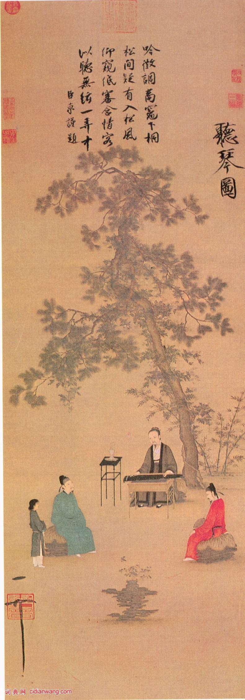 畫面上方有宰相蔡京手書七言絕句一首,右上有宋徽宗趙佶瘦金書題“聽琴圖”三字。