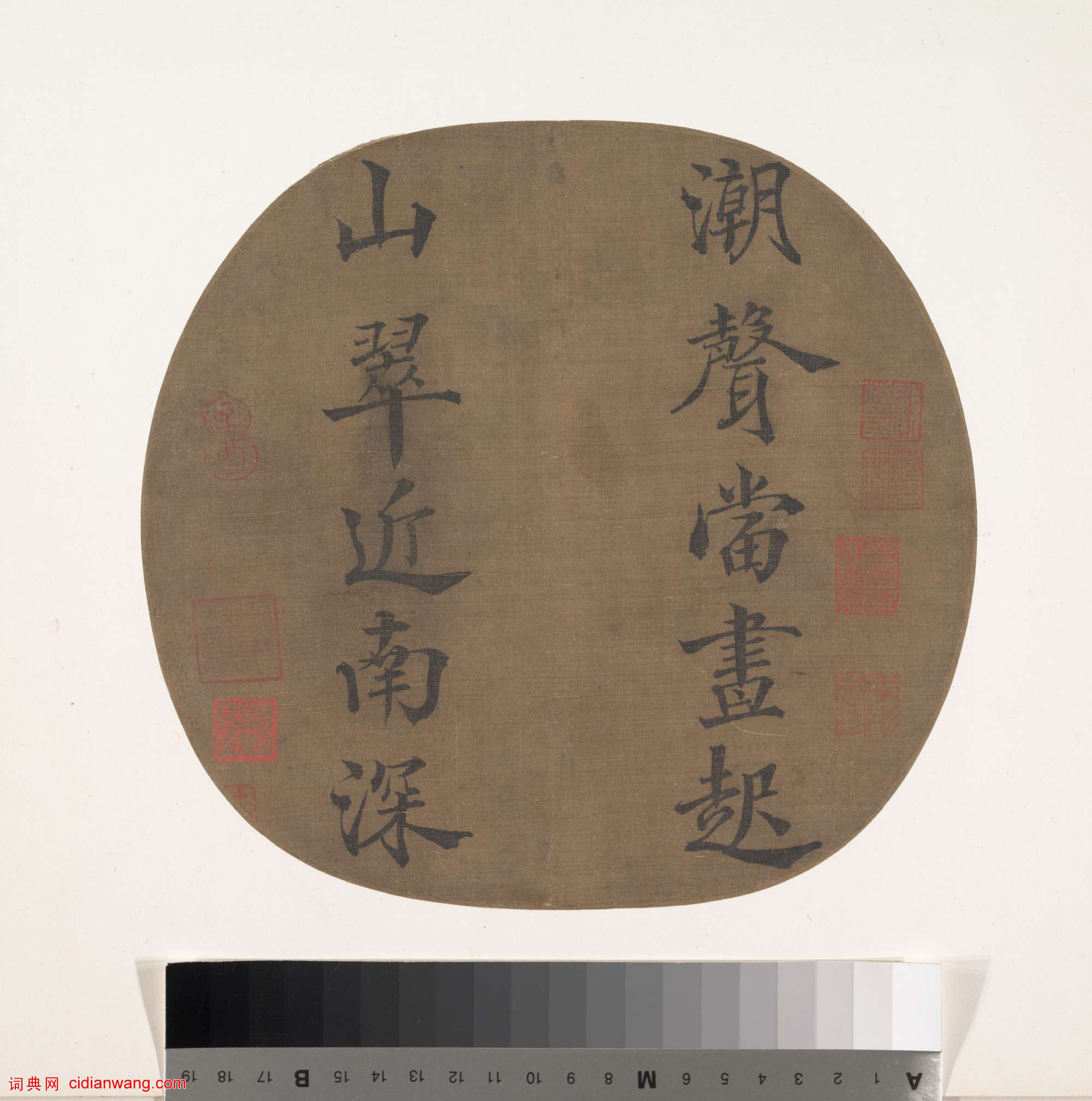 書法欣賞魏晉書法唐朝書法宋朝書法元朝書法明朝書法清朝書法近現代書法字典網>> 歷代書法>> 宋朝>> 趙昀楷書《潮聲聯團扇》正文 趙昀楷書《潮聲聯團扇》作者:趙昀 書體:楷書 宋理宗趙昀《潮聲聯團扇》 20.8 x 22.1 cm 美國紐約大都會博物館藏 顧洛阜遺贈釋文:潮聲當晝起,山翠近南深。2017-12-20 13:17:24 趙昀的相關書法作品:趙昀行書《禪室詩團扇》 趙昀楷書《潮聲聯團扇》 相關文章:柯九思·行楷題趙孟頫補書唐人臨王右軍瞻漢二帖 (行楷)柯九思《行楷題趙孟頫補書唐人臨王右軍瞻漢二帖》,來自北京匡時國際拍賣有限公司20...曹鴻勛楷書《重修玉清宮碑銘》 (楷書)曹鴻勛長於書法,專攻歐陽詢《九成宮醴泉銘》,兼工漢隸,偶作墨竹亦善。原立於濰縣城...鄭燮《行書梁武帝論書中堂》 (行書)鄭燮 《行書梁武帝論書中堂》紙本行書 190.8×118cm 台北故宮博物院藏...王獻之行楷《廿九日帖》 (行楷)王獻之行楷《廿九日帖》,此帖為《唐摹萬歲通天帖》之一。硬黃紙 唐摹本 行楷書。縱...龔賢·題《山水冊》 (行書)龔賢題《山水冊》,行書。龔賢(1618—1689)明末清初著名畫家,金陵八大家之...趙構·賜岳飛批剳卷 (行書)趙構《賜岳飛批剳卷》,紙本,行楷,縱36.7厘米,橫67.5厘米。台北故宮博物院...張雨《寄彝齋、雲林諸公五言詩札》 (小楷)張雨《寄彝齋、雲林諸公五言詩札》 紙本 上29.3×34.1cm 下29.1x...吳大澂《篆書白鶴泉銘》 (篆書)吳大澂《篆書白鶴泉銘》 釋文:光緒十有八年,歲在壬辰九月九日,撫湘使者...文徵明行草《雪詩卷》 (行草)文徵明行草書作品欣賞《雪詩卷》1536年,紙本,凡七十三行,每行字數不等,計三百...西周《哀盤》 (篆體)西周《哀盤》釋文:待更新(歡迎留言補充)