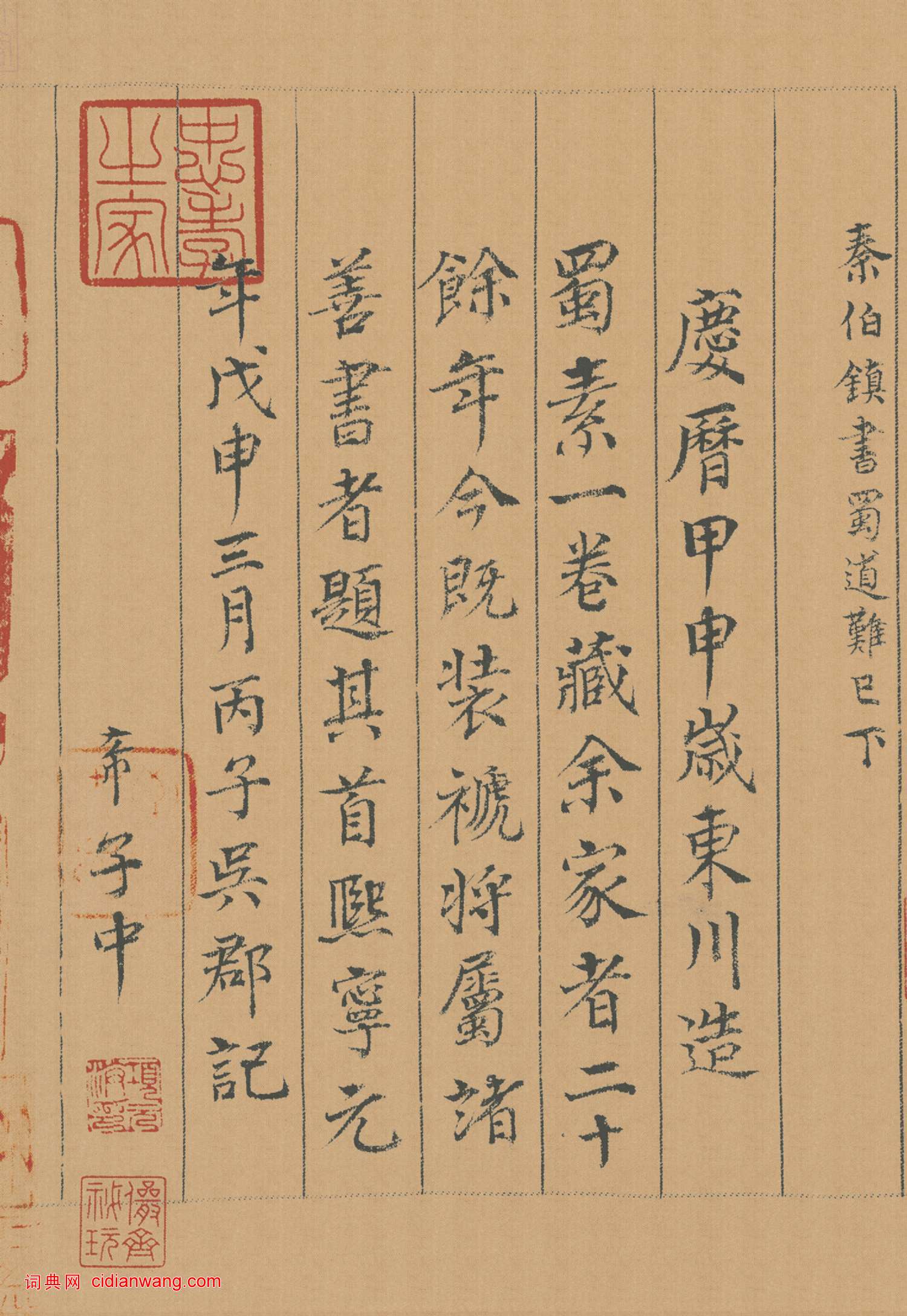 慶曆甲申(1044)歲。東川造蜀素一卷。藏余家者二十餘年。今既裝褫。將屬諸善書者題其首。熙寧元年戊申(1068)三月丙子。吳郡記。希子中。