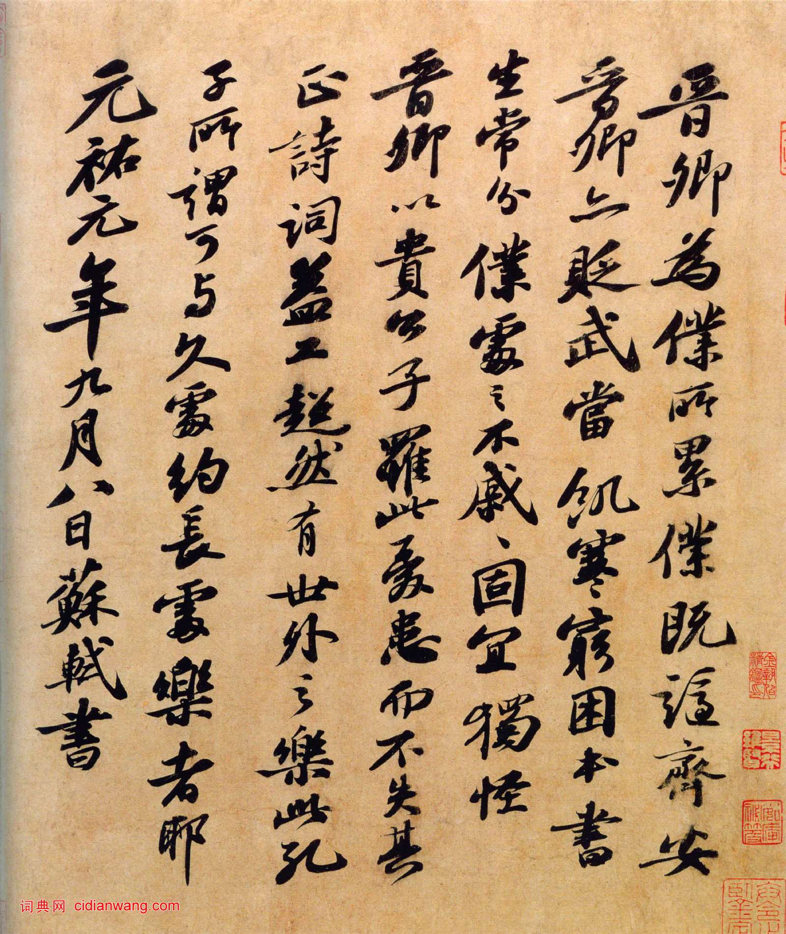 晉卿為仆所累,仆既謫齊安,晉卿亦貶武當。饑寒窮困,本書生常分,仆處之不戚戚。固宜。獨怪晉卿以貴公子罹此憂患,而不失其正,詩詞益工,超然有世外之樂。此孔子所謂可與久處約,長處樂者耶。元祐元年九月八日蘇軾書。