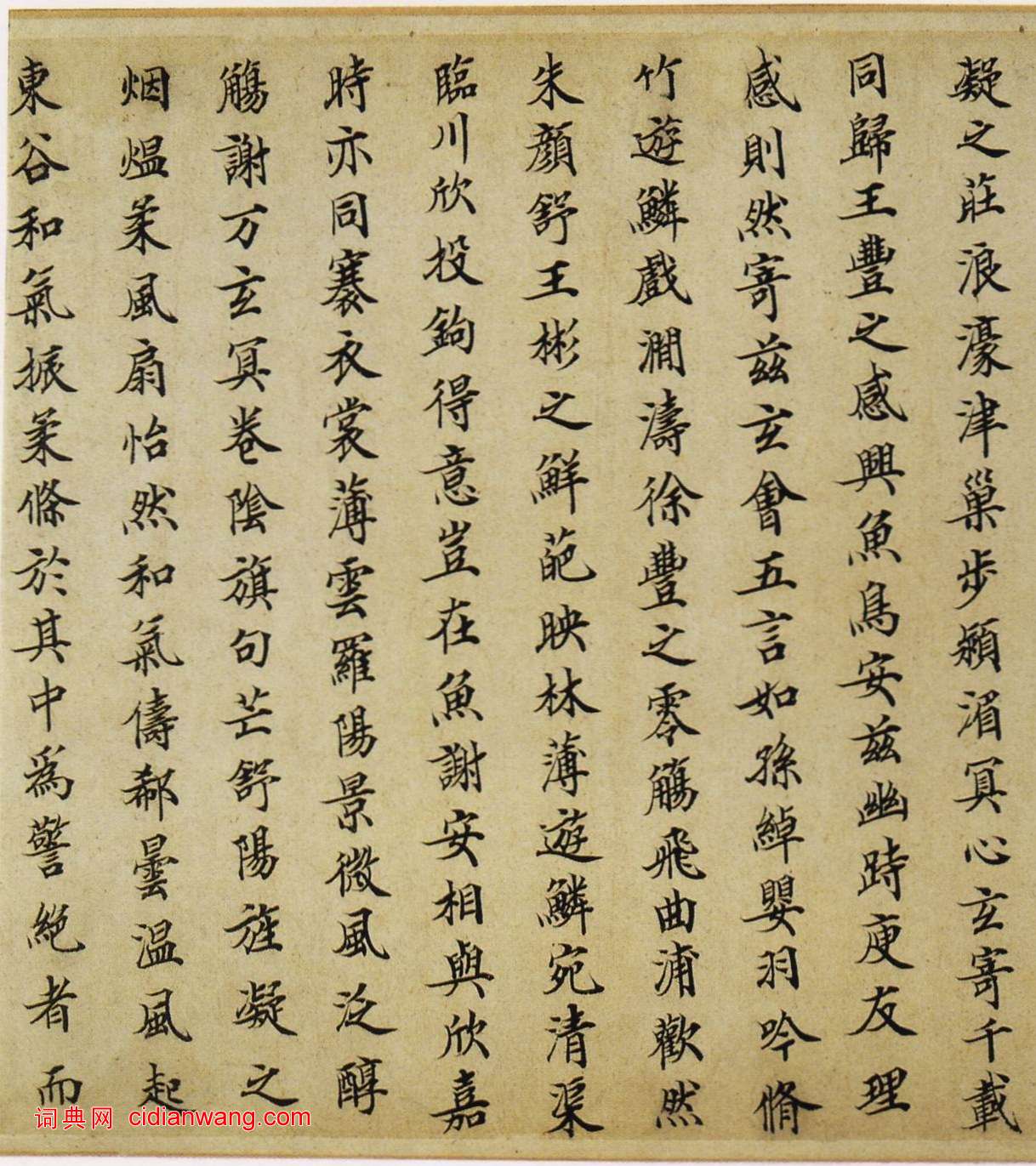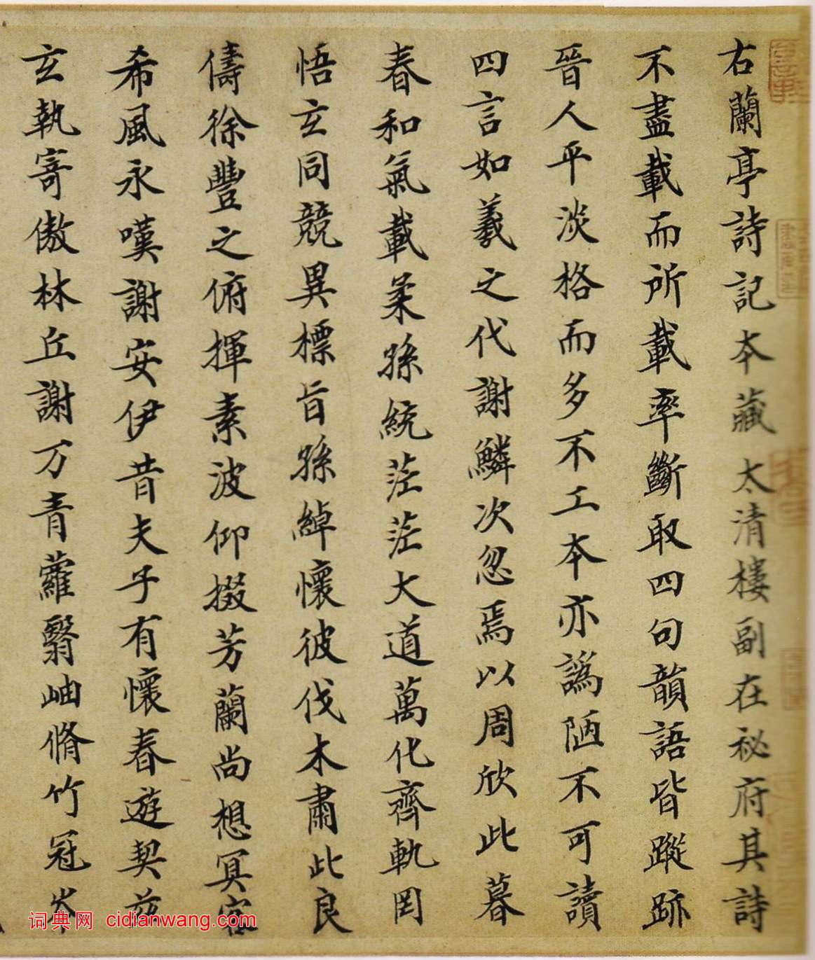 右蘭亭詩記,本藏太清樓 ,副在秘府 ,其詩不盡載,而所載率斷取四句韻語,皆從跡晉人,平淡格而多不工本亦為陋不可讀,四言如羲之:代謝鱗次,忽焉以周。欣此暮春,茫茫大道,萬化齊軌。罔悟玄同,競異摽旨,孫綽“懷彼伐木,宿此良儔...