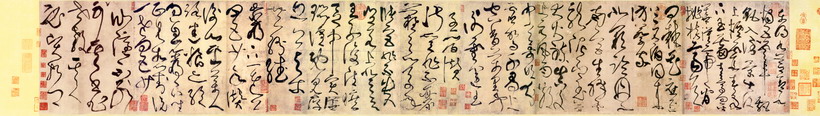 張旭《古詩四帖》墨跡本,五色箋,狂草書。縱28.8厘米,橫192.3厘米。凡40行,188字。曾經宋宣和內府、明華夏、項元汴、清宋犖、清內府等收藏,現藏於遼寧省博物館。無款,前兩首是庾信的《步虛詞》,後兩首是南朝謝靈運的《王子晉贊》和《四五少年贊》。 明董其昌定為張旭書,後人多沿此說,但也頗有爭議。董其昌依據是曾見過張旭所書《煙條詩》、《宛陵詩》,他說與《古詩四帖》的筆法相同,這二詩現在已經見不到了,連刻石拓本也無流傳。