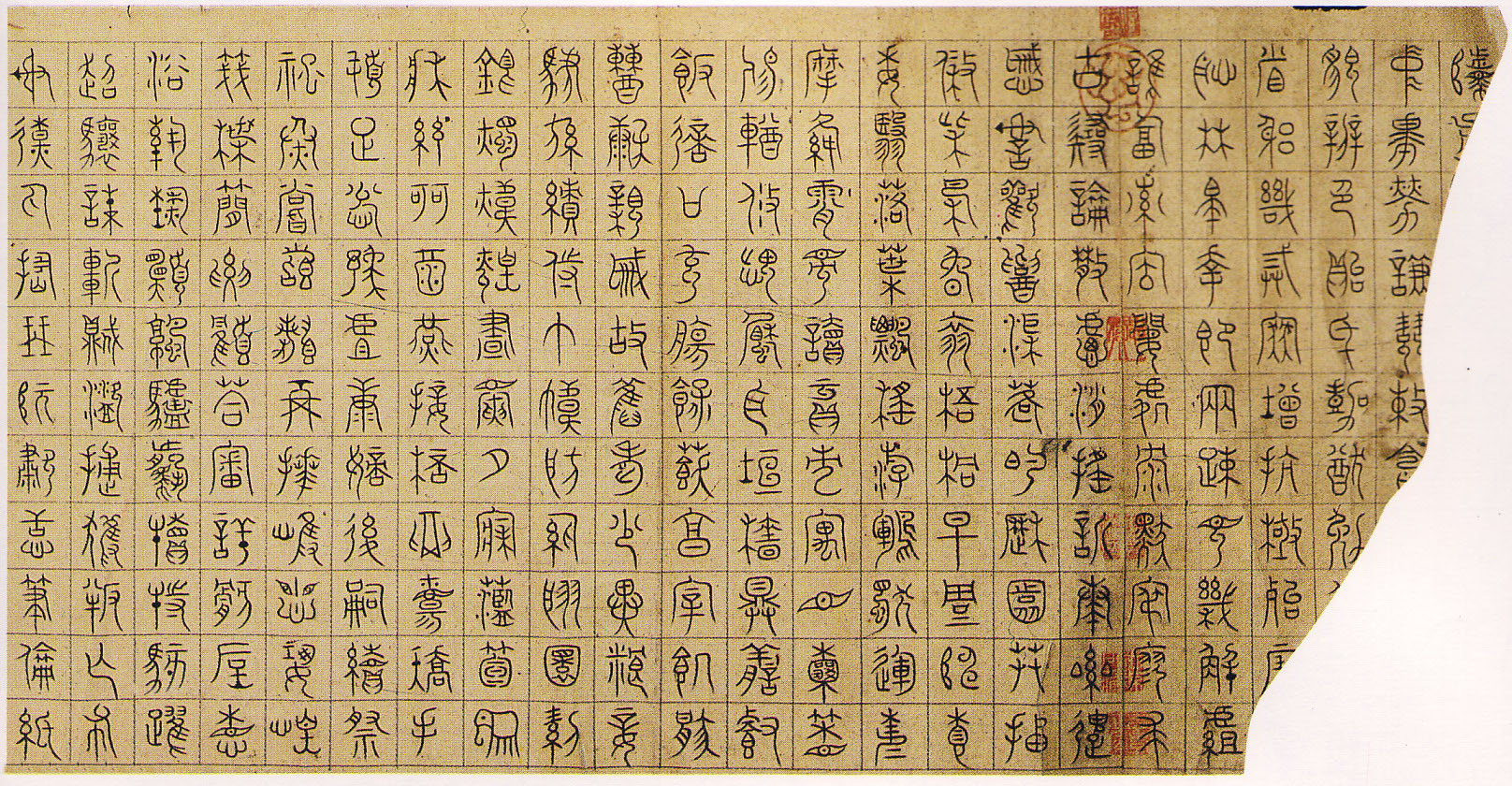 徐鉉(傳)篆書《千字文殘卷》,紙本,縱27.7厘米,橫上90.5厘米,橫下81.2厘米。黑龍江博物館院藏。