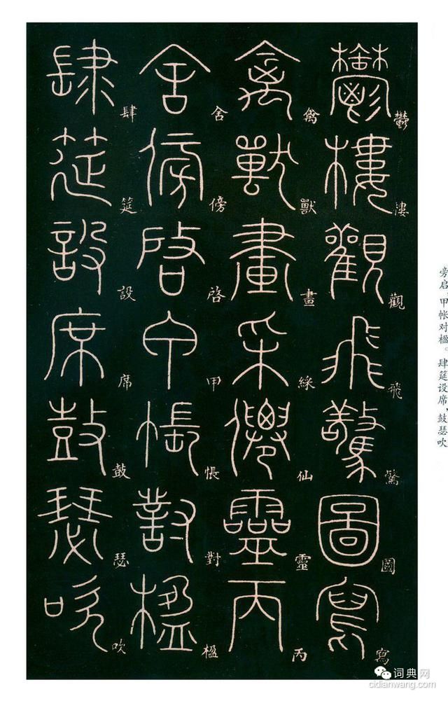 書法欣賞魏晉書法唐朝書法宋朝書法元朝書法明朝書法清朝書法近現代書法字典網>> 歷代書法>> 隋唐>> 李陽冰篆書《千字文》(楷篆對照版)(9)正文 李陽冰篆書《千字文》(楷篆對照版)(9)作者:李陽冰 書體:篆書 首 頁 上一頁 5 6 7 8 9 10 11 12 13 14 下一頁 尾 頁李陽凍的相關書法作品:李陽冰篆書《千字文》 李陽冰篆書《三墳碑》 李陽冰篆書《拪先塋記》 李陽冰篆書《千字文》(楷篆對照版) 李陽冰篆書《三墳記》 李陽冰篆書《般若台銘》 李陽冰篆書《顏家廟碑額》 李陽冰·滑台新驛記 李陽冰篆書《城隍廟碑》 相關文章:張瑞圖行草《蘇軾無言亭》 (行草)張瑞圖《行草蘇軾無言亭》詩軸 綾本 193.2×46.5厘米 年代不詳 南京博...汪士鋐行書《蟠桃賦軸》 (行書)汪士鋐《行書蟠桃賦軸》紙本行書 173.3×67.9m 上海博物院藏釋文:東海...啟功《行書七言對聯》 (行書)釋文:一笑一念一清淨,一花一葉一如來。啟功(1912——2005),自稱“姓啟名...汪士慎隸書《錄元韓性過天衣寺詩軸》 (隸書)汪士慎《隸書錄元韓性過天衣寺詩軸》紙本隸書 140×35.5cm 濟南市博物館...王鐸楷書《一覺庵銘》 (楷書)王鐸,楷書《一覺庵銘》,1646年,拓本,此柳體楷書藏於現存河南孟津縣王鐸故居。...張弼草書《蝶戀花詞軸》 (草書)張弼《蝶戀花詞軸》紙本草書 148×59.4cm 北京故宮博物院藏。此軸以草書...楊凝式《神仙起居法帖》 (草書)【釋文】神仙起居法。行住坐臥處,手摩脅與肚,心腹痛快時,兩手腸下踞,踞之澈膀腰,...喬行簡·閏余帖 (行書)喬行簡《閏余帖》,紙本冊頁,32.1cm×42.5cm。北京故宮博物院藏。《閏...文徵明《草書七律立軸》 (草書)草書七律立軸 見於中國嘉德國際拍賣有限公司2005春季拍賣會中國古代書畫專場尺 ...趙孟頫行書《高峰和尚行狀》 (行書)《高峰和尚行狀》,現藏故宮博物院,縱25.3厘米,橫715厘米。高峰和尚是元代著...