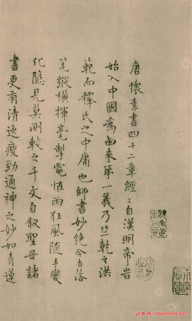 書法欣賞魏晉書法唐朝書法宋朝書法元朝書法明朝書法清朝書法近現代書法字典網>> 歷代書法>> 隋唐>> 懷素草書《佛說四十二章經》(26)正文 懷素草書《佛說四十二章經》(26)作者:懷素 書體:草書 首 頁 上一頁 17 18 19 20 21 22 23 24 25 26 懷素的相關書法作品:懷素大草《千字文》宋拓 懷素草書《藏真律公二帖》 懷素草書《食魚帖 》 懷素《小草千字文》 懷素《苦筍帖》 懷素草書《聖母帖》卷宋拓,八大山人藏 懷素·論書帖 懷素草書《自敘帖》 懷素草書《佛說四十二章經》 相關文章:側鋒和偏鋒,你寫對了嗎?在教學的過程中,常常有很多初學的朋友總是在問帖中的某一個點畫是中鋒還是偏鋒這樣的...楊法《篆書五言詩》 (篆書)楊法《篆書五言詩》 紙本 100.5×43.5cm釋文:三壽作朋句,尊前遞詠歌...倪元璐《行草“共曉承明貴”五言律詩軸》 (行草)倪元璐《行草“共曉承明貴”五言律詩軸》 北京故宮博物院藏釋文:共曉承明貴,漢臣殊...米芾《拜中嶽命作》 (行書)【釋文】拜中嶽命作。芾二。雲水心常結,風塵面久盧。重尋釣鰲客,初入選仙圖。鼠雀真...魏碑《王元祥造像》 (魏碑)北魏《王元祥造像》(整體)北魏《王元祥造像》,全稱《魏太和十八年北海王元祥為母子...龔璛《教授帖》 (行書)【釋文】記事拜複錢翼之教授足下,客袁州龔璛敬封。璛記事拜復翼之教授足下。小婿子行...“江西才子”曾棨《贈王孟安詞》 (行書)聽過“江南四大才子”,“江西才子”倒是第一次聽說!書友們就好奇了,江西才子是誰?...吳熙載篆刻欣賞《吳讓之印存》 (篆書)吳讓之(1799-1870),江蘇儀征人。清代篆刻家、書法家。包世臣的入室弟子。...陳繼儒·跋《宋拓黃庭經》 (行書)陳繼儒跋《宋拓黃庭經》,行書。法若真草書《草堂詩軸》 (草書)法若真《草書草堂詩軸》紙本草書 125.8×55.1cm 北京故宮博物院藏釋...