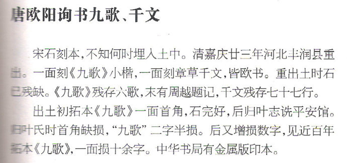 書法欣賞魏晉書法唐朝書法宋朝書法元朝書法明朝書法清朝書法近現代書法字典網>> 歷代書法>> 隋唐>> 歐陽詢小楷《九歌》正文 歐陽詢小楷《九歌》作者:歐陽詢 書體:小楷 此宋石刻本不知何時埋入土中。清嘉慶二十三年河北豐潤縣重出。一面刻《九歌》小楷,一面刻章草《千字文》,皆歐書。重出土時石已殘缺,《九歌》殘存六歌,末有周越題記,千字文殘存77行。1 2 3 4 5 6 7 下一頁 尾 頁歐陽詢的相關書法作品:歐陽詢《張翰帖》 歐陽詢小楷《九歌》 歐陽詢《定武蘭亭序》吳炳舊藏本 歐陽詢隸書《房彥謙碑》 歐陽詢《皇甫君碑》 歐陽詢行書《仲尼夢奠帖》 歐陽詢·小楷黃帝陰符經 歐陽詢楷書《皇甫誕碑》修複本 歐陽詢楷書《郭雲墓誌》 相關文章:王珣行書《伯遠帖》 (行書)《伯遠帖》,是東晉著名書法家王珣書寫的一封信,紙本,行書,共5行47字,縱25....唐寅行書《七律詩軸》龍頭獨對五千文 (行書)唐寅《行書七律詩軸》 縱146.5厘米 橫36.2厘米 蘇州博物館藏圖片來自《...王獻之·新婦地黃湯帖 (行草)【釋文】獻之白:思戀,觸事彌至。獻之既欲過餘杭,州將若比還京,必視之。來月十左右...吳寬·行書蘇軾雪詞卷 (行書)吳寬《行書蘇軾雪詞卷》,紙本。香港藝術館虛白齋藏。張穀·書札 (行楷)【釋文】我昔歸耕溪上田。扁舟來往每留連。多君又向湖濱去。惜別那堪已十年。醉呼江袖...王羲之草書《獨坐帖》 (草書)王羲之草書《獨坐帖》,4行,35字。《獨坐帖》釋文:知彼乃爾。切切!汝乃獨坐,但...康里巎巎行書《柳宗元梓人傳》 (行書)康里巎巎《柳宗元梓人傳》 作於至順二年(1331) 紙本 27.8X281cm ...柯九思·行楷題趙孟頫補書唐人臨王右軍瞻漢二帖 (行楷)柯九思《行楷題趙孟頫補書唐人臨王右軍瞻漢二帖》,來自北京匡時國際拍賣有限公司20...康有為《行書樹立忠義五言聯》 (行書)康有為《行書“樹立忠義”五言聯》 紙本行書 130cm×31.5cm×2 ...盧中南楷書《題衛夫人筆陣圖後》 (楷書)盧中南,男,1950年12月生於武漢,祖籍河南濟源。中國著名書法家,享受國務院政...