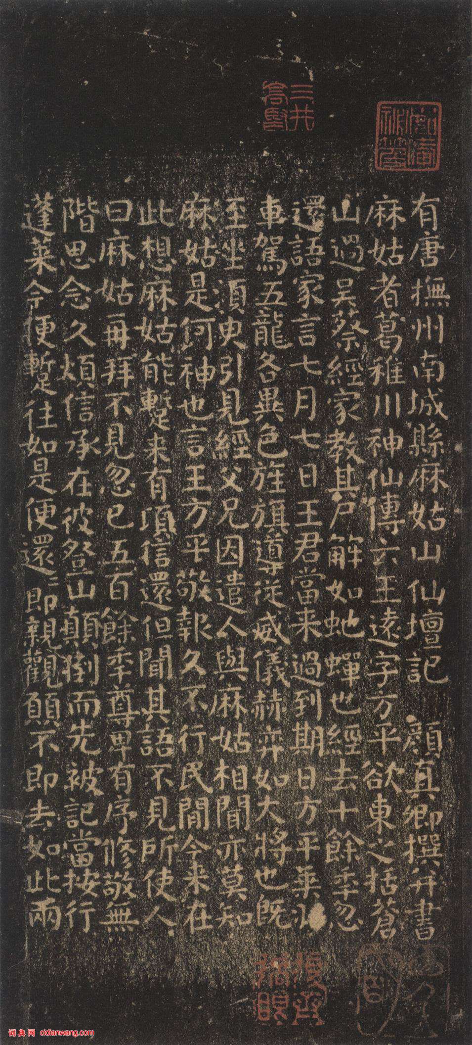 顏真卿楷書書法《麻姑仙壇記》全稱《有唐撫州南城縣麻姑山仙壇記》,有大、中、小字三個版本。大字本著錄首見歐陽修《集古錄跋尾》,原石早已毀於雷火,今存者均出於翻刻;小字本見於明文徵明父子所刻《停雲館帖》;中字本則見於南宋留元剛所刻《忠義堂帖》。
