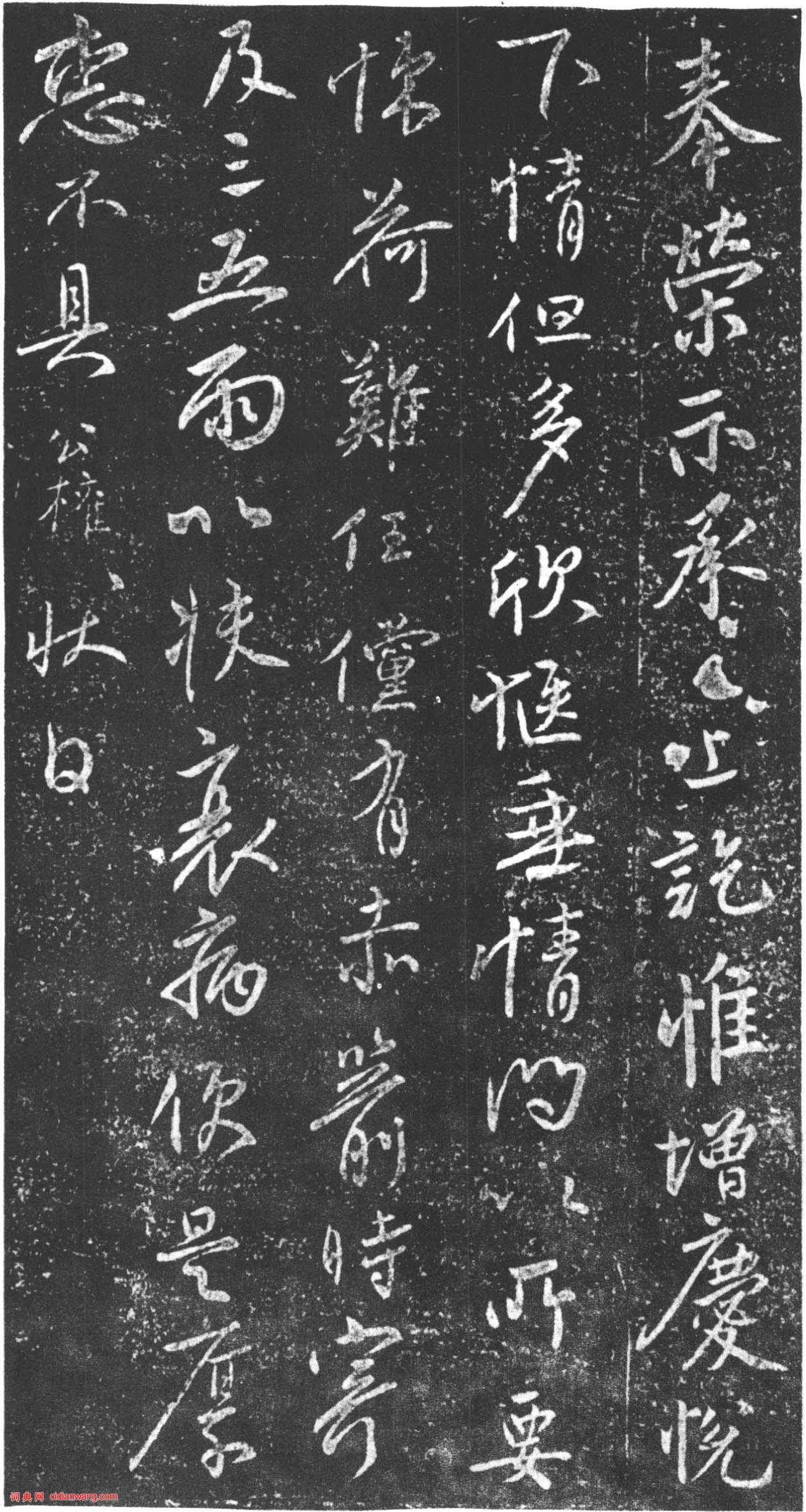 書法欣賞魏晉書法唐朝書法宋朝書法元朝書法明朝書法清朝書法近現代書法字典網>> 歷代書法>> 隋唐>> 柳公權行書《奉榮帖》正文 柳公權行書《奉榮帖》作者:柳公權 書體:行書 柳公權《奉榮帖》(又名《赤箭帖》、《榮示帖》) 行書 【釋文】:奉榮示,承已上訖,惟增慶悅,下情但多欣愜。垂情問以所要,悚荷難任。償有赤箭,時寄及三五兩,以扶衰病,便是厚惠。不具,公權狀白。柳公權的相關書法作品:柳公權楷書《教弟子言》 柳公權《蒙詔帖》 柳公權楷書《陸士衡演連珠》 柳公權楷書《高元裕神道碑》 柳公權楷書《魏謨先廟碑》 柳公權楷書《原道碑》 柳公權楷書《金剛經》唐拓孤本 柳公權楷書《復東林寺碑》 柳公權行書《蘭亭詩》卷 相關文章:東漢隸書《熹平石經》 (隸書)熹平石經殘石 漢熹十四年( 175年)碑陽高31厘米,寬66厘米;碑陰高33厘米...文徵明《歸去來兮辭》 (楷書)《歸去來兮辭》頁,明,文徵明書,紙本,楷書,縱13.7cm,橫16.1cm。北京...王鴻緒《行書杜甫詩軸》 (行書)王鴻緒《行書杜甫詩軸》紙本行書 95×56cm 重慶市博物館藏。釋文:十日畫一...米芾《蜀素帖》 (行書)米芾蜀素帖實在精妙北宋時,蜀地(四川)生產一種質地精良的本色絹,稱為蜀素。有個叫...顏真卿小楷《麻姑仙壇記》 (小楷)顏真卿楷書書法《麻姑仙壇記》全稱《有唐撫州南城縣麻姑山仙壇記》,有大、中、小字三...來楚生隸書《養成準備七言聯》 (隸書)來楚生《隸書養成準備七言聯》 65×11cm×2 私人藏【資料來源】《海派代...東漢《夏承碑》民國石印本 (隸書)《夏承碑》民國石印本 濟南市圖書館藏此碑全稱《漢北海淳于長夏承碑》,又名《夏仲兗...《董美人墓誌》北京大學藏本 (楷書)《董美人墓誌》全稱《美人董氏墓志銘》。隋開皇十七年(公元597年)刻,原石於清嘉...吳大澂《篆書白鶴泉銘》 (篆書)吳大澂《篆書白鶴泉銘》 釋文:光緒十有八年,歲在壬辰九月九日,撫湘使者...彭睿壦行草《劉長卿詩軸》 (行草)彭睿壦《劉長卿詩軸》紙本行草書 157.8×41.8cm 康熙32年(1693...