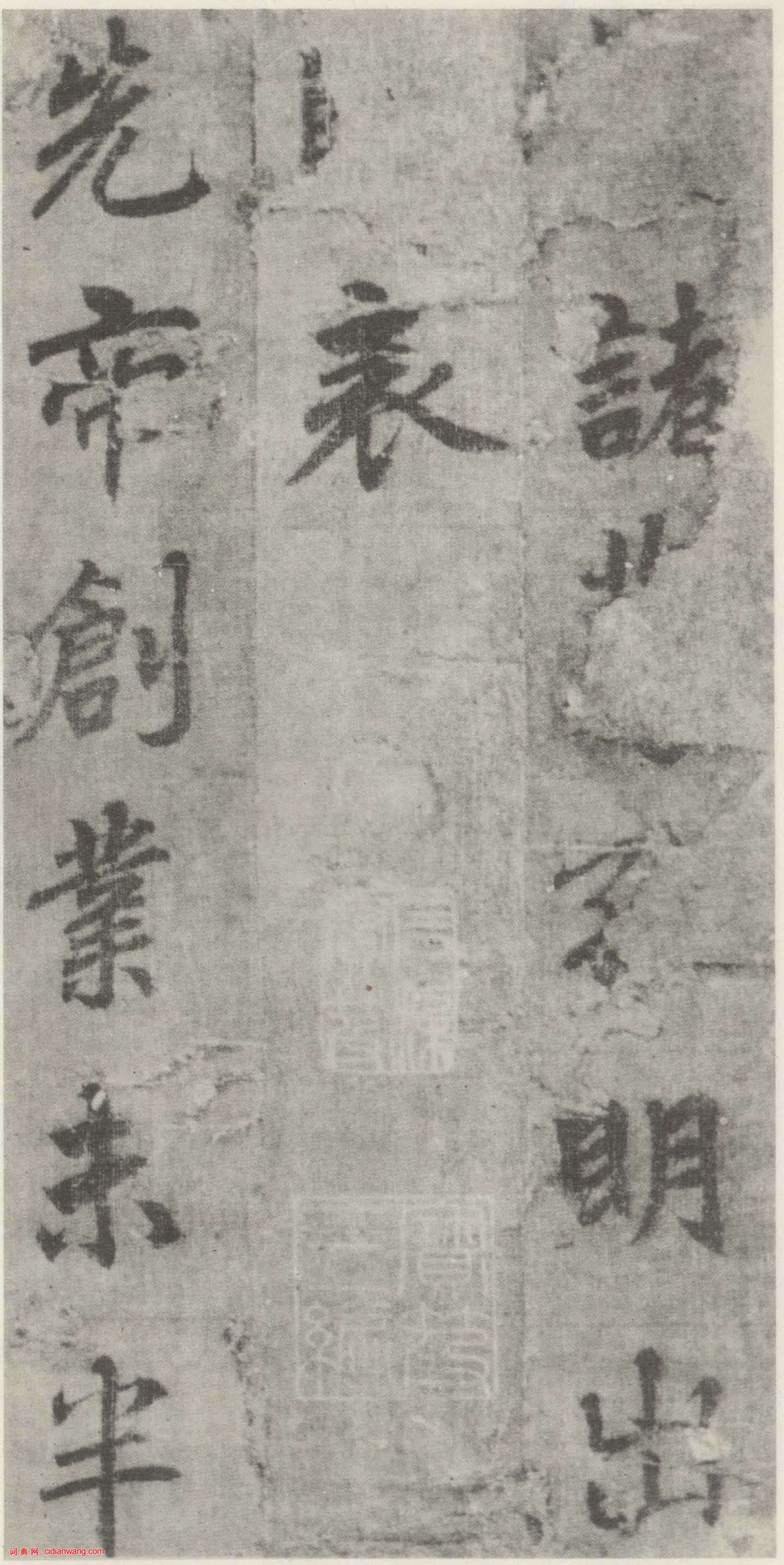 《出師表》墨跡,行書,無款絹本,割裂成冊。原本今藏台灣故宮博物院,前有嘉慶御覽之寶,宣統御覽之寶,石渠寶笈等印,後半及署款皆殘缺,書者名不可考,書勢似李邕,清《滋蕙堂帖》曾刻,直署為李北海書,近人王壯為編入《中國書畫》定為真跡。此冊不見宋明著錄,落筆結字莊峻有法,較《四言古詩卷》為優,以李書《法華寺》,《李思訓》等碑較之,神韻若合。然有一二未愜意之筆,若非邕書,當為學邕書之善者。