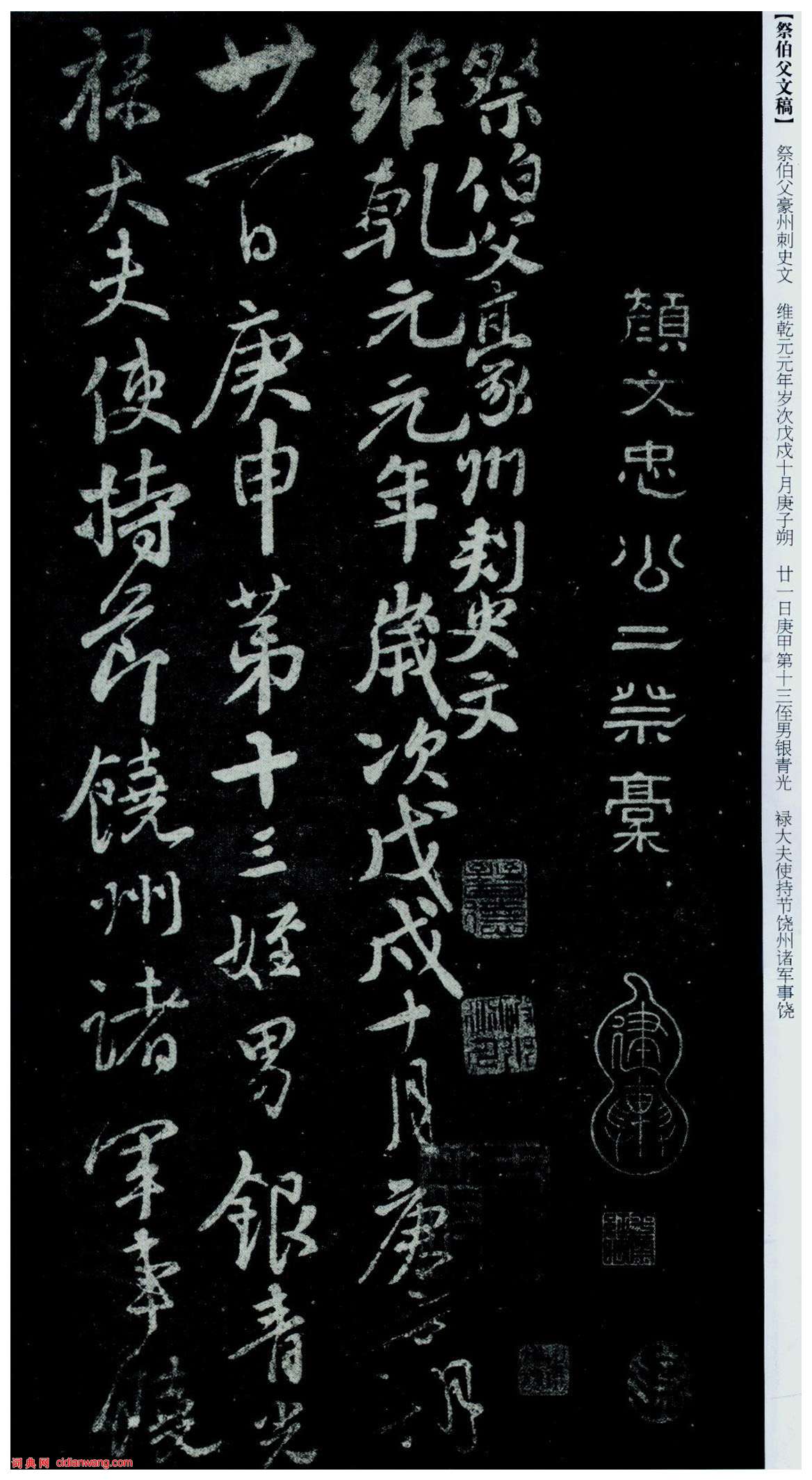 又稱《告伯父文稿》,全稱《祭伯父濠州刺史文》。自署書於乾元元年(758年) ,行草書,文稿一篇。凡36行,計410字。原刻早佚,見宋《甲秀堂帖》本。此稿與《祭侄稿》、《爭座位帖》世稱“三稿”。