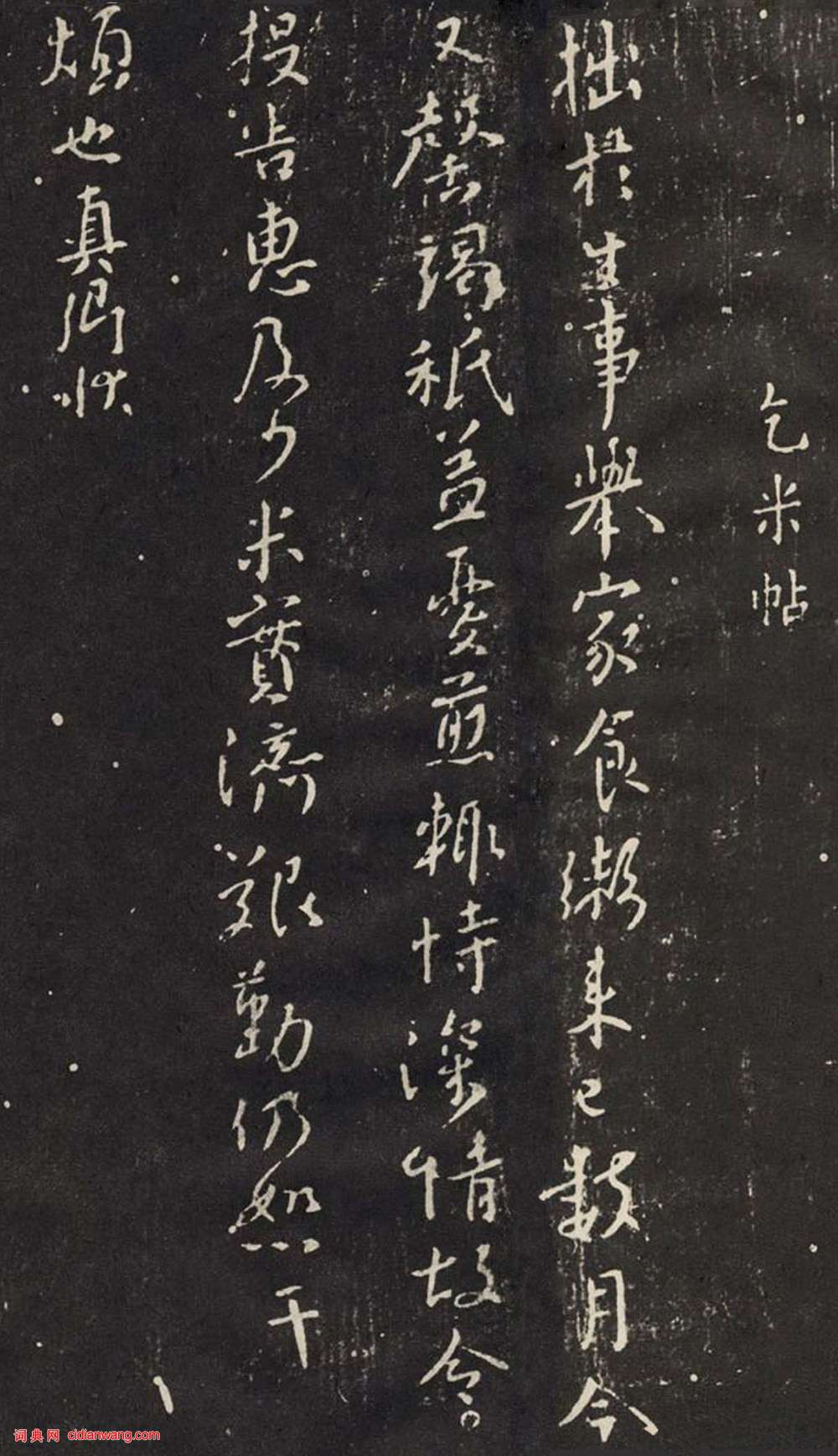 據宋歐陽修《集古錄》云:“此本墨跡在余亡友王子野家。子野生於相家而清苦甚寒士,嘗模帖刻石遺於朋友。”米芾《寶章待訪錄》云:《乞米帖》“真帖楮紙在朝請郎蘇 處,度支郎中舜元子也。得於關中安氏,士人多有臨拓本。此卷古玉軸,縫有‘舜元’字印,范仲淹而下題跋。”後真跡迷失。可見北宋時,已有臨拓本傳世。《忠義堂帖》不見“舜元”字印及諸人題跋,當是以模本入石者。