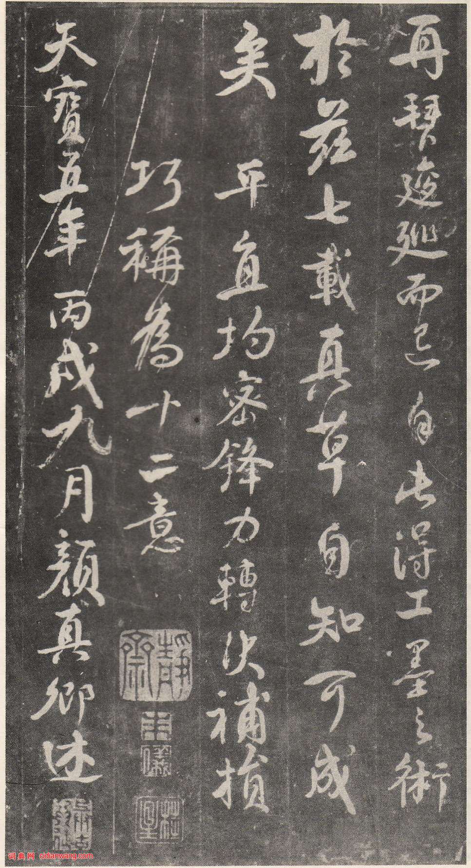 按此拓末昕署之年款推之,為魯公三十八歲時所作,早《多寶塔》六年,早《祭侄稿》十二年,早《爭坐帖》十八年,傳世魯公書跡未見有早於是年者。唯天寶建元,改“年”為“載”,此署“天寶五年”,行筆亦未若魯公它書之精斂,或乃後人仿魯公之筆。然觀其行氣錯落奇正,如溶金瀉地,雖有一二稚嫩之筆,而絕非文、董以後人所能仿佛;文亦多與傳世之本不同,非按本鈔錄者可比。視虞(世南)之《汝南公主墓誌》,褚遂良之《陰符經》同為不可多得之藝林珍品。手此一卷於探討書淪,研習筆法,皆不無俾益。