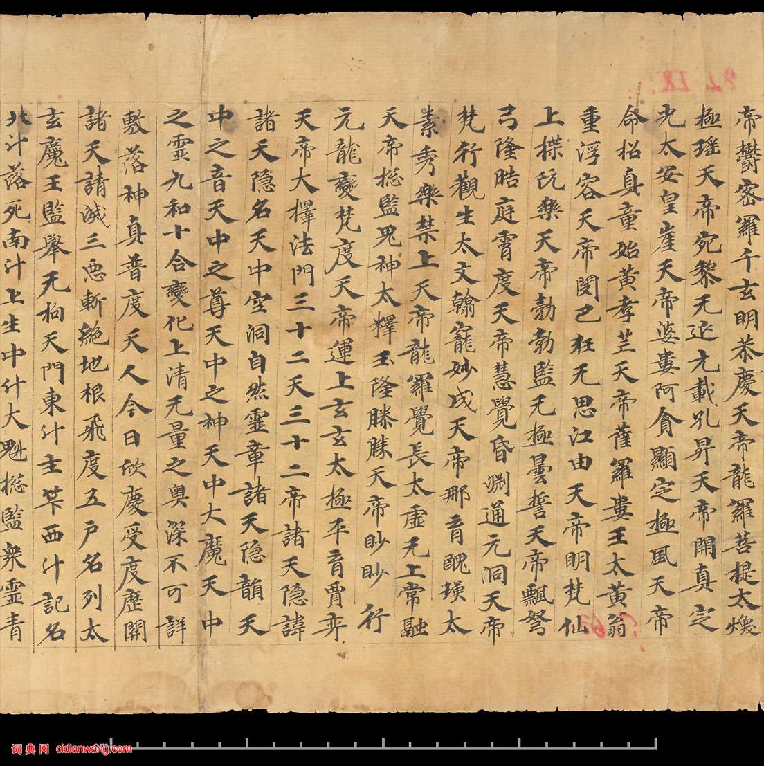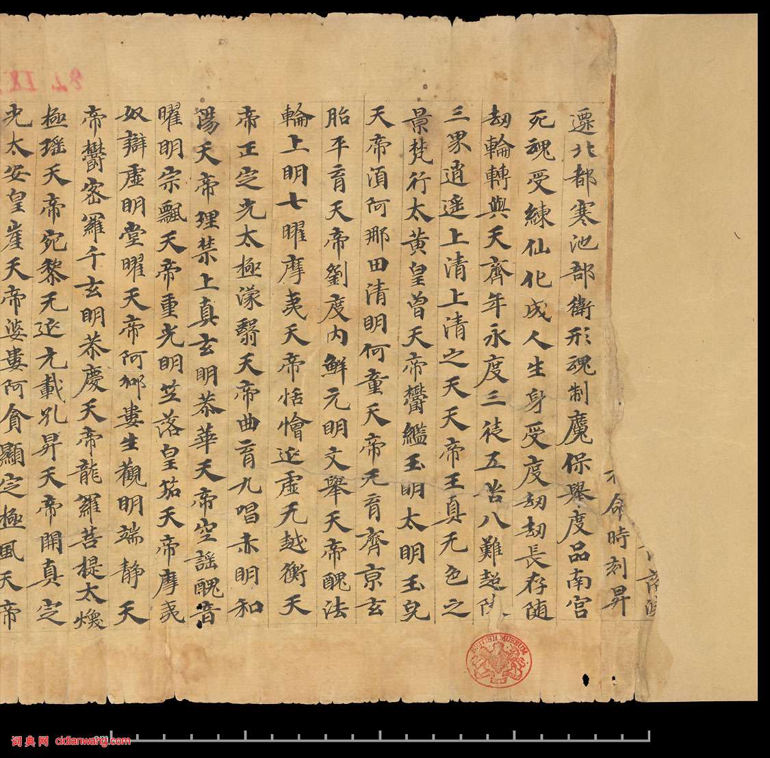書法欣賞魏晉書法唐朝書法宋朝書法元朝書法明朝書法清朝書法近現代書法字典網>> 歷代書法>> 隋唐>> 道教經典《太上洞玄靈寶無量度人上品妙經》正文 道教經典《太上洞玄靈寶無量度人上品妙經》作者:不詳 書體:楷書 道教經典《太上洞玄靈寶無量度人上品妙經》 紙本,捲軸。25.5 x 243 cm 敦煌。英國大英圖書館藏。 1 2 3 4 5 下一頁 尾 頁相關文章:王升《衰老帖》 (行草)【釋文】升再拜 衰老杜門多病 久不承興居之問 日益系詠 近魏端叔見臨 能道動止之...北魏《元倪墓誌》 (楷書)北魏《元倪墓誌》,全稱《魏故寧遠將軍敦煌鎮將元君墓志銘》。北魏正光四年(523)...王鐸《跋西嶽華山廟碑》 (小楷)王鐸《跋西嶽華山廟碑》,小楷。王鐸明末清初貳臣、書畫家。字覺斯,一字覺之。號十樵...米芾《彥和帖》 (行草)【釋文】芾頓首啟。經宿。 尊候沖勝。山試 納文府。且看芭山。暫 給一視其背。即定...張即之行書《棐茗帖》 (行書)張即之《棐茗帖》紙本行書 26.8×23.6cm 釋文:棐茗皆山中珍品拜貺感銘...劉重慶·跋趙孟頫《吳興賦》 (行書)劉重慶跋趙孟頫《吳興賦》,縱25.2厘米。現藏浙江省博物館。趙孟頫《閒居賦》 (行書)趙孟頫《閒居賦》,行書,縱38厘米,橫248.3厘米。北京故宮博物院藏。書西晉著...王鐸《米芾行書天馬賦跋》 (小楷)王鐸《米芾行書天馬賦跋》,小楷。王鐸小楷自家模樣,《米芾行書天馬賦跋》似以更自由...張雨行書《自書詩冊》 (行書)至正五年(1345) 張雨《自書雜詩冊》粉花箋 23.7×15.3cm×24...張適小楷·周上卿傳 (小楷)張適書《周上卿傳》,紙本,小楷,25.8cm×145.9cm。遼寧省博物館藏。...