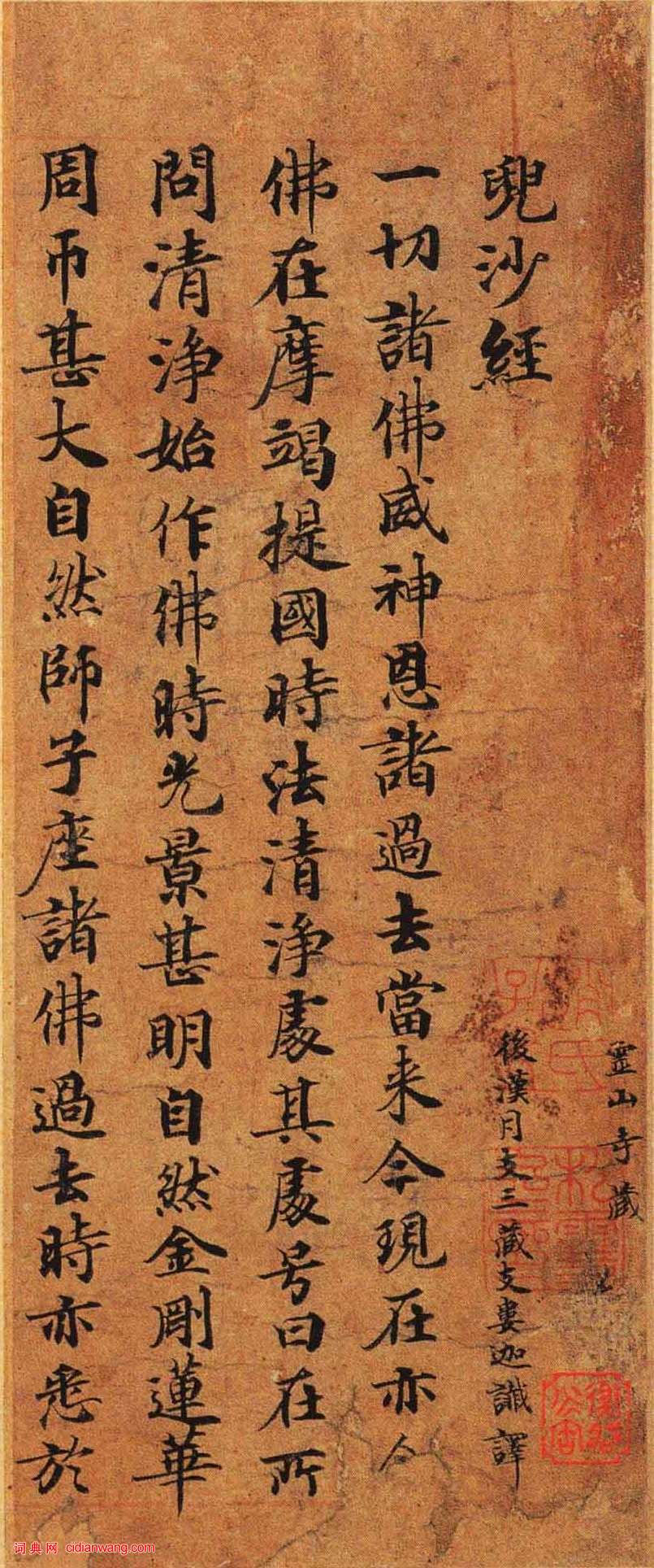 書法欣賞魏晉書法唐朝書法宋朝書法元朝書法明朝書法清朝書法近現代書法字典網>> 歷代書法>> 隋唐>> 唐人寫經小楷《兜沙經》正文 唐人寫經小楷《兜沙經》作者:不詳 書體:小楷 唐《兜沙經》紙本 12開 每頁24×10cm 北京故宮博物院藏 “兜沙經”,冊裝共12開,無款識,署“天祐四年(907年)七月日……”乃唐祚之末五代之始,其書法與唐代楷書主流一脈相承,謹嚴有法,骨體挺拔,具北碑風規,為唐寫經中的珍稀之物。首頁下端鈐“趙氏子昂”、“松雪齋印”。知曾經趙孟頫鑑藏。1 2 3 4 5 6 7 8 9 10 下一頁 尾 頁相關文章:文徵明《點閘帖》 (楷書)文徵明《點閘帖》,楷書尺牘,故宮博物院藏。釋文:自考試後欲一詣,左右屬、巡按公在...江南四大才子,個個有絕技江南四大才子又稱“吳門四才子”,是明代時生活在江蘇蘇州的四位才華橫溢且性情灑脫的...吳大澂《篆書知過論軸》 (篆書)吳大澂《篆書知過論軸》花箋紙本篆書 129.3×60.3cm 北京故宮博物院藏...仇遠·跋陳琳《溪鳧圖》 (行書)仇遠跋陳琳《溪鳧圖》,行書,台北故宮博物院藏。梁章鉅·跋《唐摹蘭亭序》 (行楷)【釋文】道光丁亥,余在吳門新購得米跋黃絹本《褚臨蘭亭》時,聞有此本,亟借來對勘一...文徵明行草《憶昔四首次陳魯南韻》軸 (行草)文徵明行草軸 縱158厘米、橫71.5厘米。釋文:紫殿東頭敞北扉,史臣都著尚方衣...王鴻緒《行書杜甫詩軸》 (行書)王鴻緒《行書杜甫詩軸》紙本行書 95×56cm 重慶市博物館藏。釋文:十日畫一...清代著名女書法家書法欣賞導讀:女子無才便是德,不識寫字吧?那你就錯了。李清照領銜婉約詞,管道升代夫執筆可...王寵《草書七律詩》軸 (草書)王寵《草書七律詩》軸 紙本 行草 141.8×28.3cm 北京故宮博物院藏 ...顏真卿行草《劉中使帖》 (行草)顏真卿《劉中使帖》約書於大曆十年(775年)。墨跡。行書,信札。28.5×43...