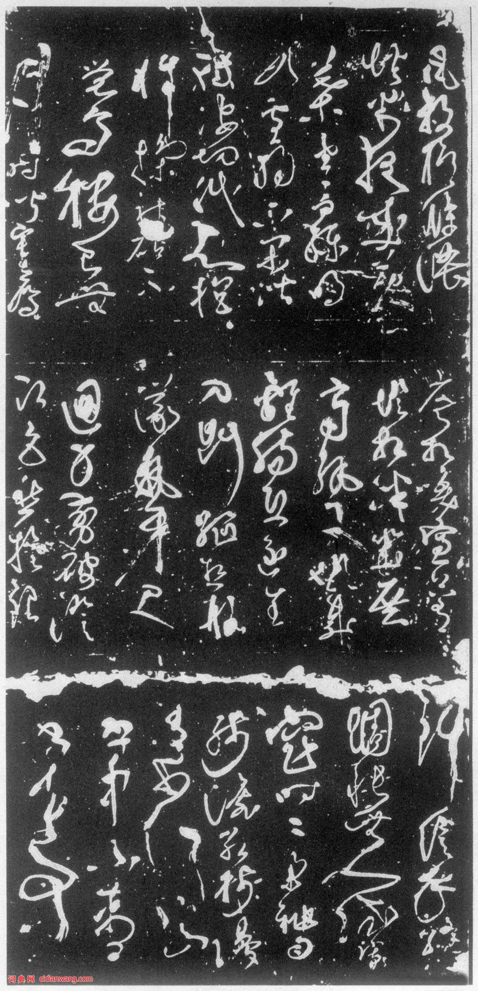 原石豎方形,兩面分三截刻。草書內容為《寄邊衣詩》和《入洛詩》,碑陰下段一併摹刻有張旭《肚痛帖》。