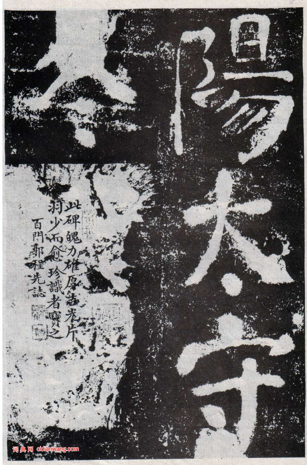 此本系五石拓本,甚罕見計存全字四十七字缺半字七,共存五十四字。其中“尚未”之“未”“水者”之“者”又“虛口”之“虛”字皆完好。另有羅振玉在光緒三十三年(1907)題記兩側。 羅振玉題跋譯文:《離堆記》舊拓本,計殘石五塊,存全字四十七,缺半字七,共存字五十四。今但存殘石四,其“處置使人忠貶邰陽太守冬”十一石亡矣。郭尚先先生《芳豎館提拔》言:此記存四十四字,知此記嘉道以來一失去一石矣。此五石尚在於。當石乾嘉時拓本,可寶也,丁未六月寒中題記。又今本:‘尚未’之‘未’,‘水者’之‘者’‘虛口江’之‘虛’三字,又有缺失,此本尚完好,寒中又記。