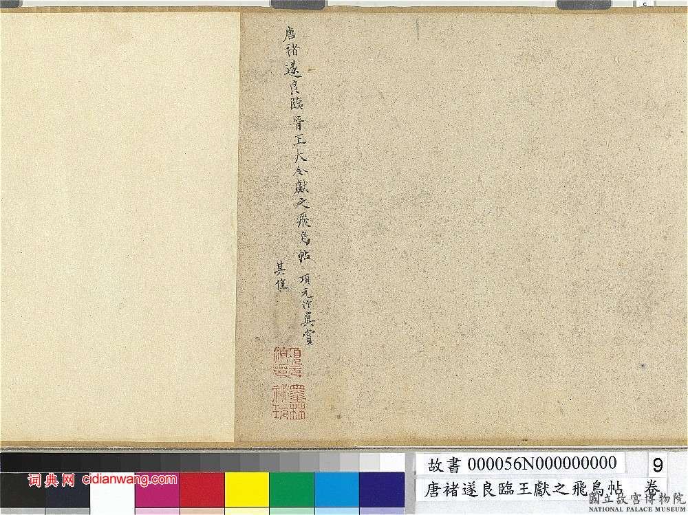褚遂良臨王獻之《飛鳥帖》正書二十一行,麻紙本,縱二二公分,橫四七.四公分。後有元柯九思、王守誠二跋,《石渠寶笈初編》有著錄,原跡今藏台北故宮博物院。