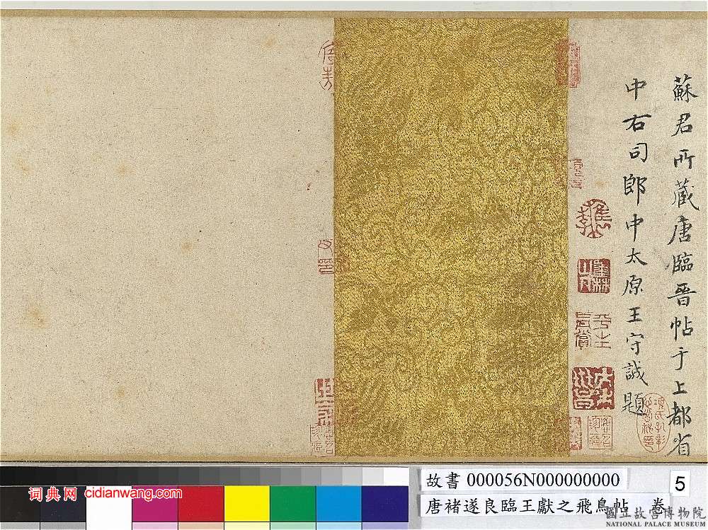柯九思跋:右褚河南臨大令飛鳥帖。唐人所摹。具有元常遺法。足以知字畫源流之有自也。況絕無宋人氣。是唐無疑耳。奎章閣學士院鑒書博士柯九思跋。