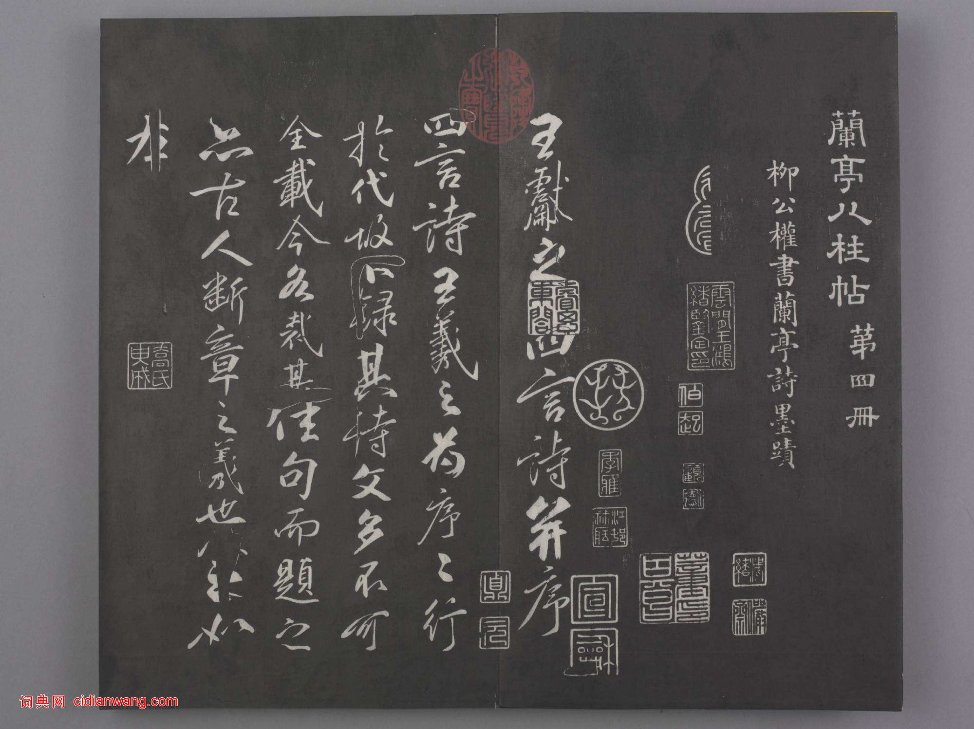 柳公權書蘭亭詩,墨跡勾摹上石,墨跡行書,無名款。卷前有乾隆皇帝題簽“蘭亭八柱第四”;卷後有宋、金、明、清人諸多題跋。其中北宋黃伯思(偽)一小隸書跋稱為柳公權所書;以後,則多誤以為是柳公權的作品。此帖書法與柳書不符,據專家考證應為唐代書手所為。此墨跡本為故宮藏品。