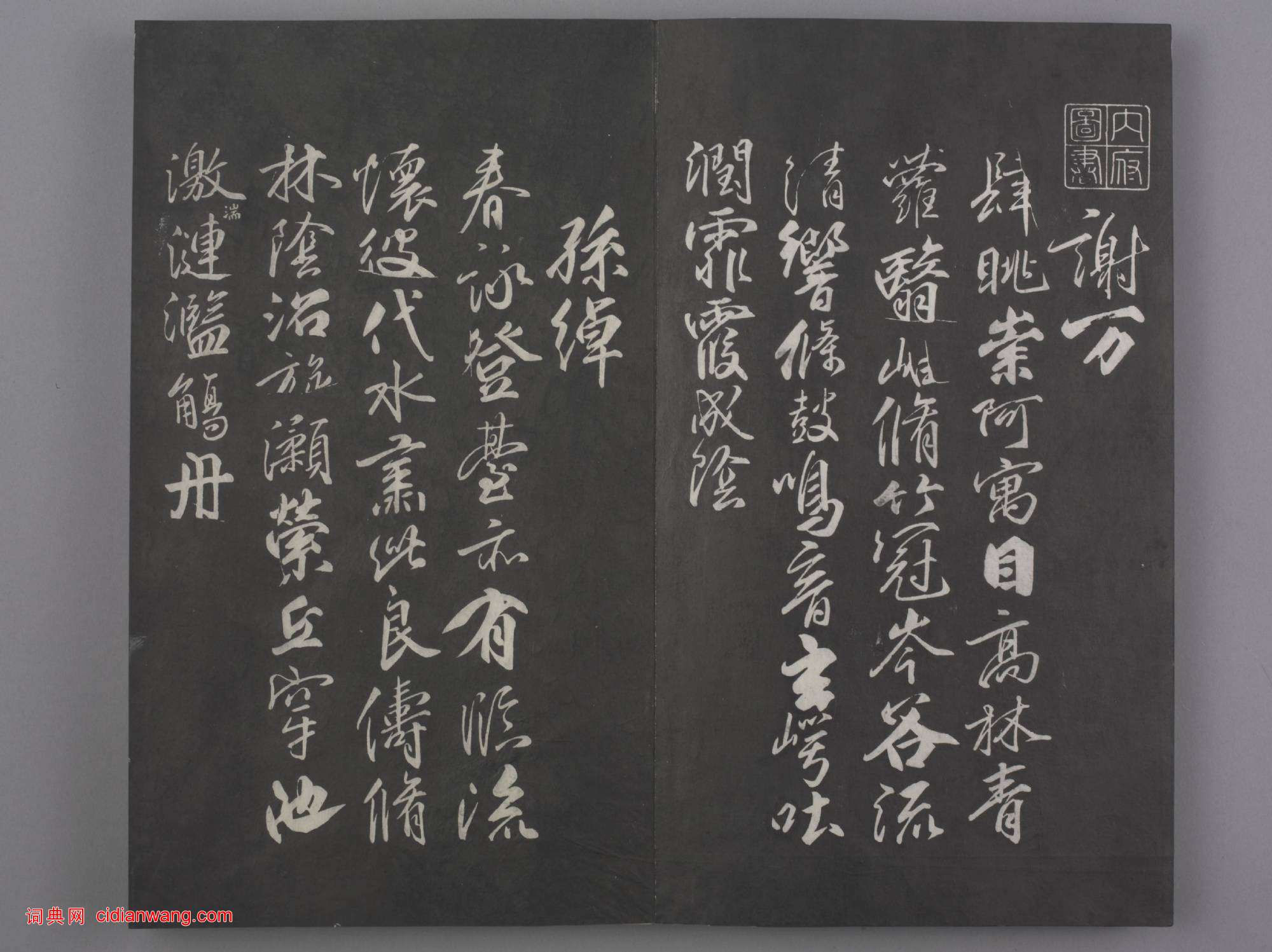 清拓《蘭亭八柱帖》柳公權書蘭亭詩,木面。烏金精拓,刻拓俱佳,經折裝,每開縱29.8厘米,橫34.6厘米,北京故宮博物院藏。