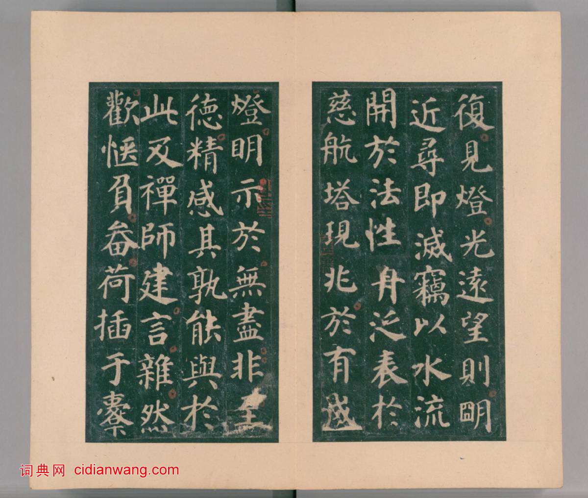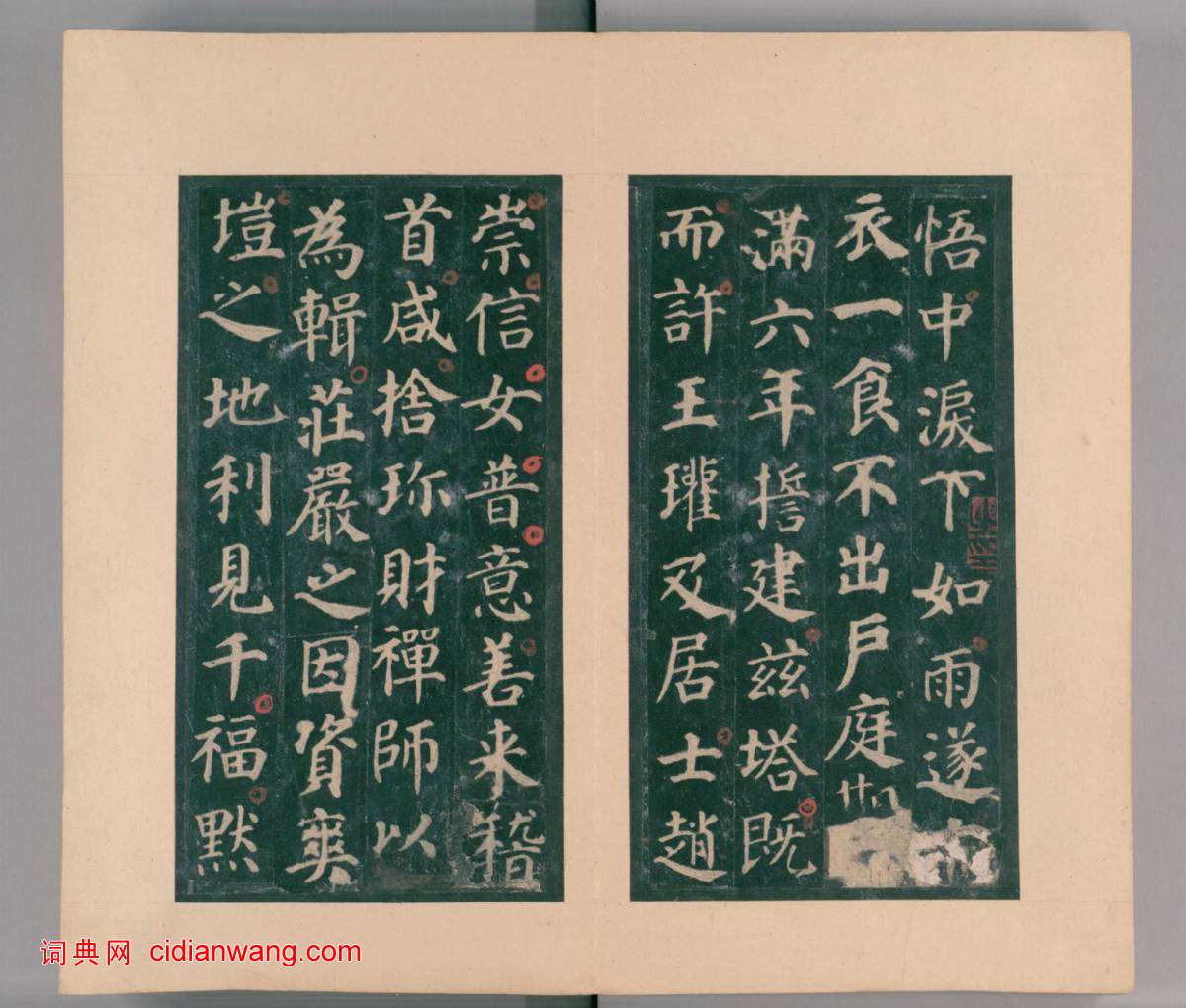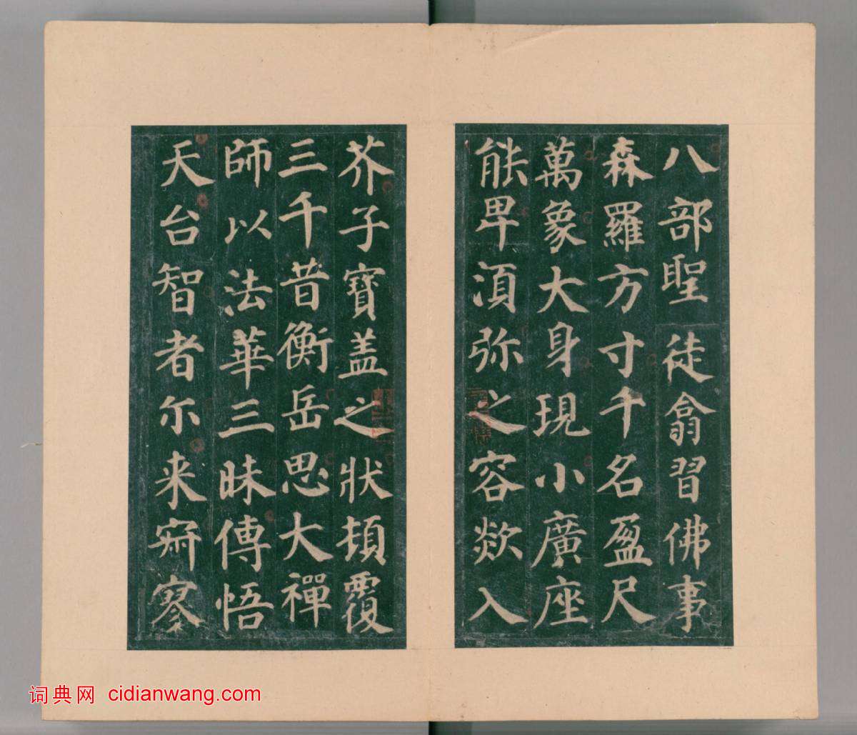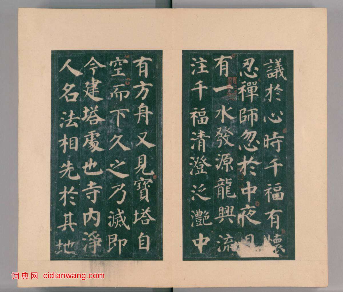 顏真卿《多寶塔碑》,全稱《大唐西京千福寺多寶塔感應碑》,天寶十一年(752)四月廿日建,岑勛撰文,顏真卿書丹,徐浩題額,史華刻字,三十四行,行六十六字,現藏西安碑林。碑文寫的是西京龍興寺和尚楚今靜夜涌讀《法華經》時,仿佛時時有多寶佛塔呈現眼前,他決心把幻覺中的多寶佛塔變為現實,天寶元年選中千福寺興工,四年始成。在千福寺中每年為皇帝和蒼生書寫《法華經》、《菩薩戒經》,這在佛教史上,有特殊的意義。