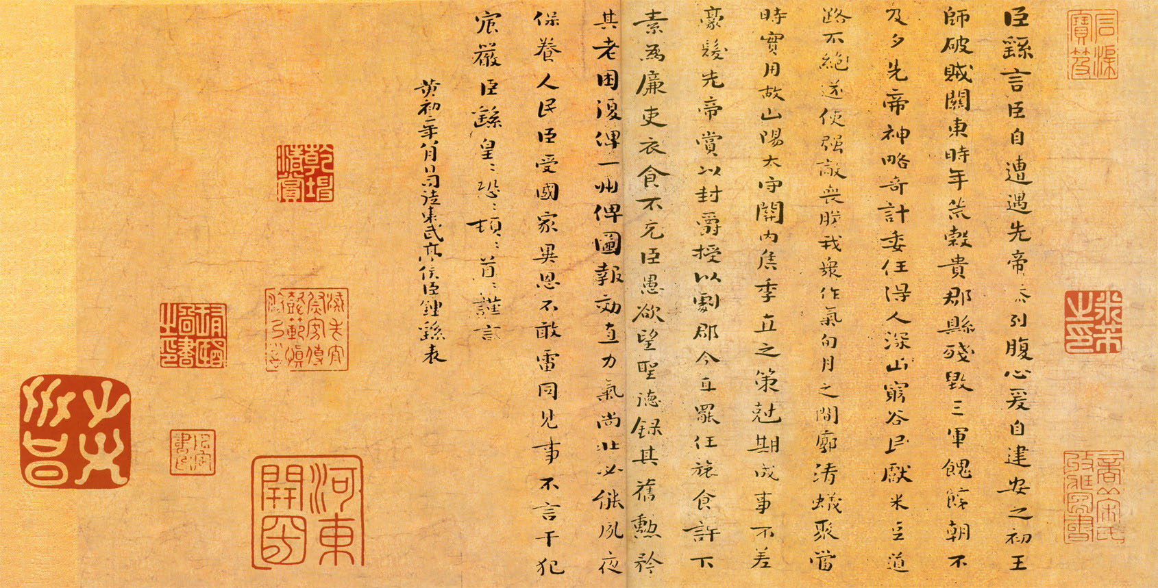 鍾繇書於魏黃初二年(221),楷書,書時鐘繇已七十高齡。此表內容為推薦舊臣關內侯季直的表奏。原墨跡本於1860年英法聯軍焚掠圓明園時為一英兵所劫。後輾轉落入一收藏家手中,又被小偷竊去埋入地下,挖出時已腐爛。幸有一照片留存。明代刻入《真賞齋帖》,清代刻入《三希堂》,列諸篇之首。