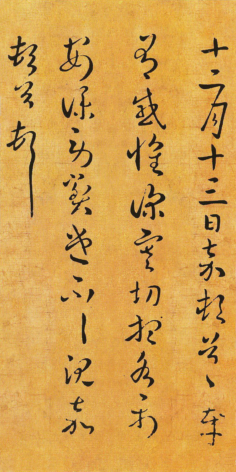 書法欣賞魏晉書法唐朝書法宋朝書法元朝書法明朝書法清朝書法近現代書法字典網>> 歷代書法>> 魏晉>> 沈嘉《十二月十三日帖》正文 沈嘉《十二月十三日帖》作者:沈嘉 書體:草書 東晉 沈嘉《十二月十三日帖》,草書。此帖用筆沉穩,點畫的起、行、收都一絲不苟。點法精妙是此作一大特色。以對點為例同,第一行“首”、第二行“深”、第三行“仆、遣”、第四行“首”,絕無雷同,各有其美。此作結字中字勢必向右下伸展的字占有很大比例,這在同時代的作品中是不多見的。如“月、嘉、頓、感懷、切、勞、遣”等字,這樣的處理是十分獨到的。相關文章:吳叡隸書《離騷》 (吳叡)吳叡《篆隸書離騷千字文合卷》全本 上海博物館藏 28.2×223.3 2...全國第一屆書法篆刻展作品集-行書部分1980年5月,全國第一屆書法篆刻展覽(國展)在瀋陽展出,現與大家分享由人民美術...張瑞圖《行書六言聯句》 (行書)張瑞圖《行書六言聯句》軸 紙本 356×99厘米 年代不詳 榮寶齋藏釋文:修竹...祝允明草書《自書詩卷》 (草書)祝允明《自書詩卷》 紙本草書,47.3×321.3cm 正德十五年(公元152...鄧石如篆書《逍遙仿佛七言聯》 (篆書)篆書七言聯 192.0x39.4 cm 墨跡紙本 美國弗利爾美術館藏釋文:逍遙於...蔡翛·致子通都監尺牘 (行書)【釋文】翛啟 辱手畢 伏承尊候萬福 至以感慰 承薰修未畢 來日不得晤見 豈任馳情...北魏《張黑女墓誌》 (楷書)《張黑女墓誌》全稱《魏故南陽太守張玄墓誌》,有稱《張玄墓誌》。張玄字黑女,因避清...董其昌行書《心經》 (行書)董其昌行書《心經》,明崇禎六年書於長安。董其昌(1555-1636),字玄宰,華...錢溥·跋褚遂良《倪寬贊》 (楷書)錢溥跋褚遂良《倪寬贊》,縱24.6厘米,台北故宮博物院藏。米漢雯《行書七律詩軸》 (行書)米漢雯《行書七律詩軸》絹本行書 216×63.8cm 天津博物館藏 釋文:水晶...
