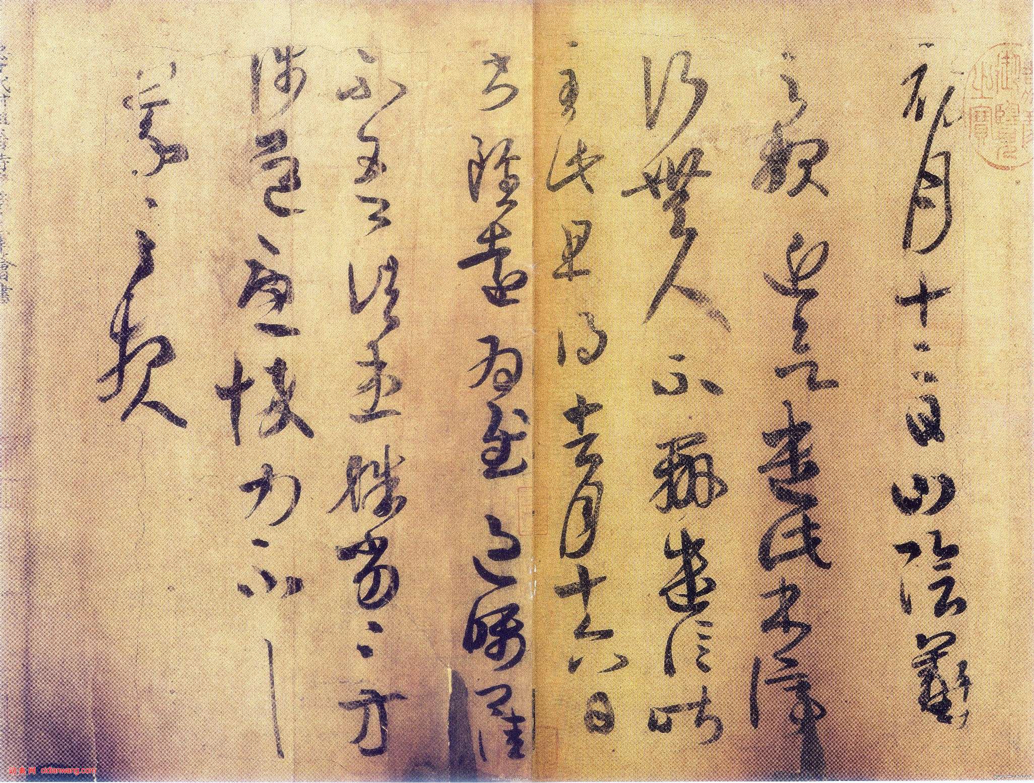 《初月帖》,紙本,遼寧省博物館藏。此帖為《唐摹萬歲通天帖》之二。王羲之父名“正”,為避父諱,“正月”書為“初月”。首句‘山陰羲之報’,知此帖寫于山陰。山陰是會稽郡郡治所在地。穆帝永和七年(三五一年)王羲之赴山陰為會稽內史,其年四十九歲。此帖當是其四十九歲以後所寫。此帖是王羲之留存至今最好的書帖之一。此帖用筆、結字和章法都有章草的特點。