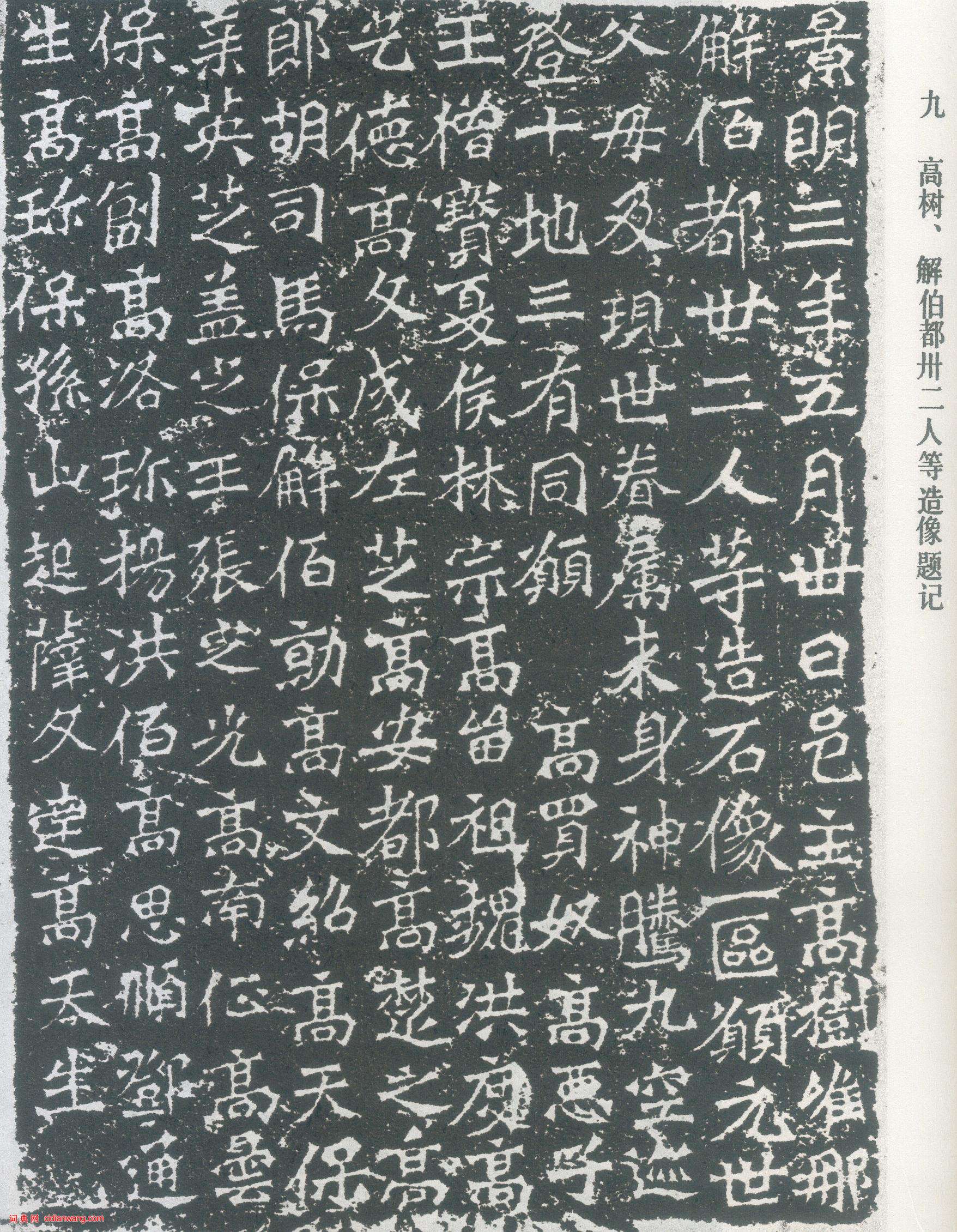 龍門二十品之《高樹造像題記》,全稱《邑主高樹、唯那解伯都卅二人等造像題記》。正書十行,一行14字。可見一百三十九字,書法峻整勁健。景明三(502)年五月刻。在古陽洞北壁。造像龕位於古陽洞北壁右側,與步輦郎妻一弗為亡夫造像記為鄰。龕高94厘米、寬78厘米、深13厘米,主佛結跏趺坐,主佛兩側有二脅侍菩薩,均有背光。此龕完成於景明三年五月三十日。造像記位於造像龕左下方,高40厘米,寬28厘米。記載邑主高樹、解伯都等三十二人的邑社造像,共同祝願仙逝父母及見存眷屬的來生。造像時間於孫秋生二百人造石像記同年同月完工,發願文也大致相同。