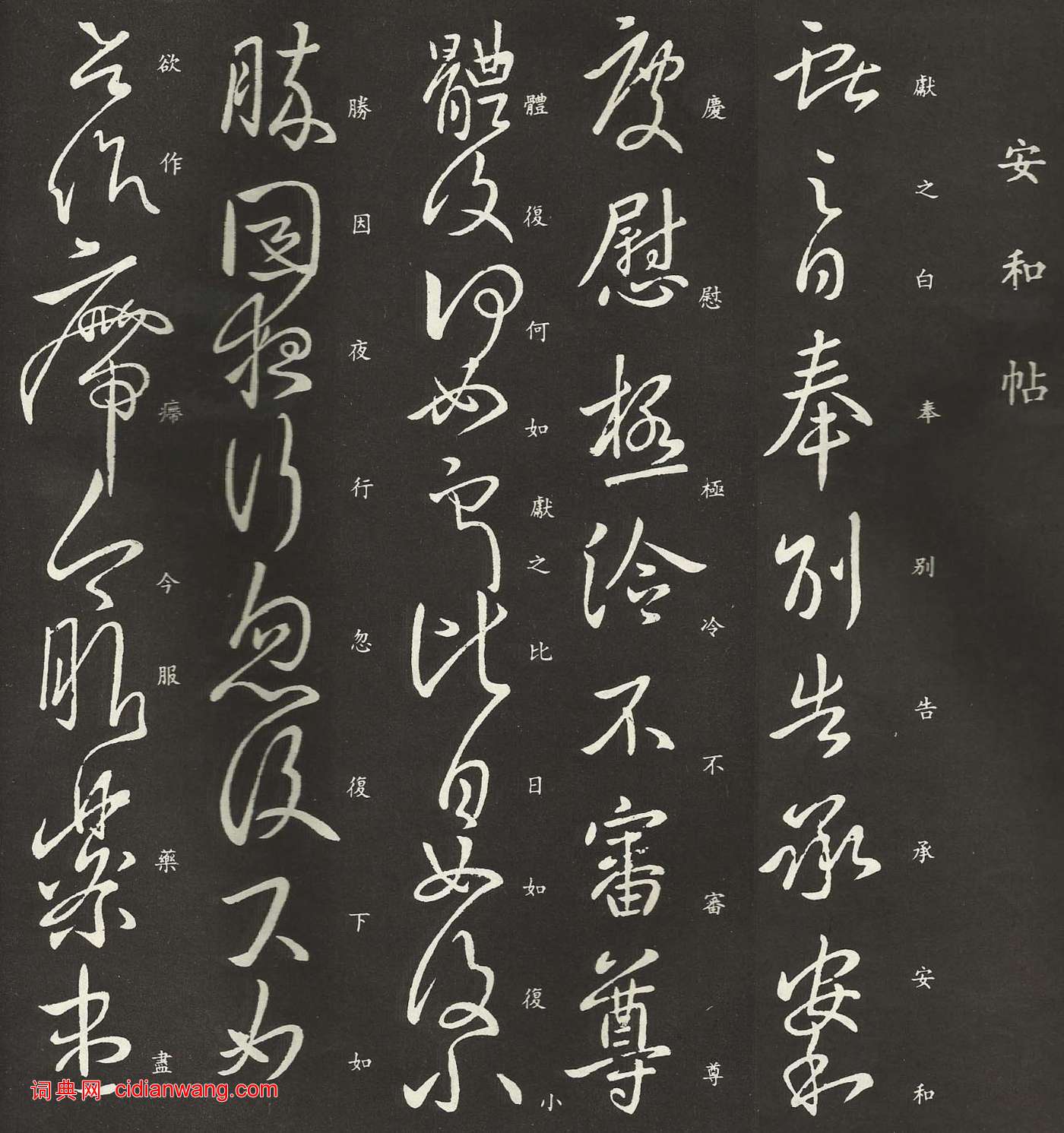 王獻之《安和帖》又名《奉別帖》拓本,行草書。11行,84字。入刻《淳化閣帖》《大觀帖》。