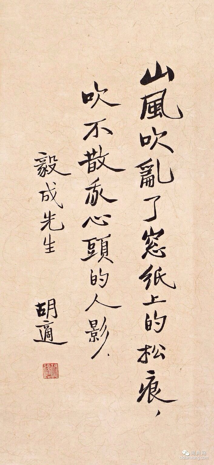 書法欣賞魏晉書法唐朝書法宋朝書法元朝書法明朝書法清朝書法近現代書法字典網>> 歷代書法>> 近現代>> 胡適書法作品欣賞(3)正文 胡適書法作品欣賞(3)作者:胡適 書體:行楷 首 頁 上一頁 1 2 3 4 下一頁 尾 頁相關文章:啟功行書《自作詩九首》 (行書)啟功老人的書法,之所以可親而讓人喜歡,還有一個原因是老人的文藝素養高,不僅能寫字...吳熙載行書《節臨顏真卿爭坐位帖扇面》 (行書)吳熙載《節臨顏真卿爭坐位帖扇面》紙本行書 18.1×53cm 北京故宮博物院藏...虞世南《大運帖》 (楷書)【釋文】世南聞大運不測,天地兩平;風俗相承,帝基能厚;道清三百,鴻業六超;君壽九...鄧石如《四體書冊》 (四體)鄧石如《四體書冊》(局部) 每頁29.5×44.0cm 嘉慶二年(1797)日...黃道周楷書《王忠文祠碑文》 (小楷)黃道周《王忠文祠碑文》紙本楷書(局部)30×261.5cm 廣東省博物館藏 ...趙孟頫《雪岩和尚拄杖歌卷》 (行書)趙孟頫《雪岩和尚拄杖歌卷》,紙本,縱23.5cm,橫53.6cm。原卷25cm×...脫脫木兒·跋張先《十詠圖》 (行書)【釋文】吳興老子會南園,十詠於今只獨傳。瀟灑丹青如一日,風流文彩未千年。情留去燕...沈傳師楷書《柳州羅池廟碑》 (楷書)《柳州羅池廟碑》為沈傳師53歲時所書,碑文由大文學家韓愈撰寫,紀念頌揚柳宗元被貶...岳珂·郡符帖 (楷書)岳珂《郡符帖》,紙本,楷書,30.3×49.5cm。北京故宮博物院藏。此帖楷書...陳植行書《懷存齋詩帖》 (行書)陳植《懷存齋詩帖》 紙本行書 23.3×56.4cm 北京故宮博物院藏這是陳植...