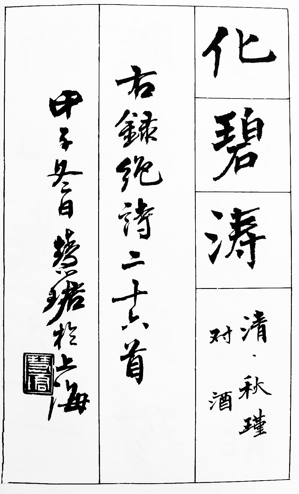 書法欣賞魏晉書法唐朝書法宋朝書法元朝書法明朝書法清朝書法近現代書法字典網>> 歷代書法>> 近現代>> 周慧珺《古詩楷書學生字帖》(24)正文 周慧珺《古詩楷書學生字帖》(24)作者:周慧珺 書體:行楷 首 頁 上一頁 15 16 17 18 19 20 21 22 23 24 全文2016-3-20 11:35:34 周慧珺的相關書法作品:周慧珺楷書字帖《長恨歌》 周慧珺《古詩楷書學生字帖》 周慧珺楷書《前後赤壁賦》 相關文章:鄧石如篆書《四箴四條屏》 (篆書)《四箴四條屏》,篆書,紙本,縱206cm,橫31.3cm。北京故宮博物院藏。此屏...蕭嫻行書《樓船鐵馬四言聯》 (行書)蕭嫻《樓船鐵馬四言聯》江蘇省美術館藏釋文:樓船夜雪,鐵馬秋風。 款署:黔南蕭嫻。...東漢隸書《白石神君碑》 (隸書)東漢隸書碑刻。陰文篆額題《白石神君碑》。有碑陰題名。光和六年(183)立。碑原在...李東陽《草書雜詩卷》 (草書)李東陽《草書雜詩卷》紙本行草 29×259.2cm 上海博物館藏釋文:春興 小...米芾·秋暑憩多景樓帖 (行書)米芾《秋暑憩多景樓帖》,紙本,行書,縱27.6厘米,橫34.3厘米。北京故宮博物...文嘉《行書致顧元慶札》 (行書)文嘉《行書致顧元慶札》 38×34cm 上海博物館藏釋文:家君日來偶有小事,所...樓鑰·題徐鉉篆書帖 (行書)【釋文】舊見岸老筆談載騎省竵匾之說,近有敷原王季中、彥良,實襄敏諸孫。余及見其莫...東漢隸書《尹宙碑》 (隸書)《尹宙碑》全稱《 漢故豫州從事尹府君銘 》。東漢隸書碑刻。篆額已殘,止存從、銘兩...書法最常用繁簡字、異體字對照表書法最常用繁簡字、異體字對照表:●並,並,併:古代完全不通用。並,併 是同義詞,...瞧!這才是古法造紙【導讀】手造的楮皮紙,不及機械紙平滑光潔,但筆觸墨染與這些草屑雜質相遇處,便有了...