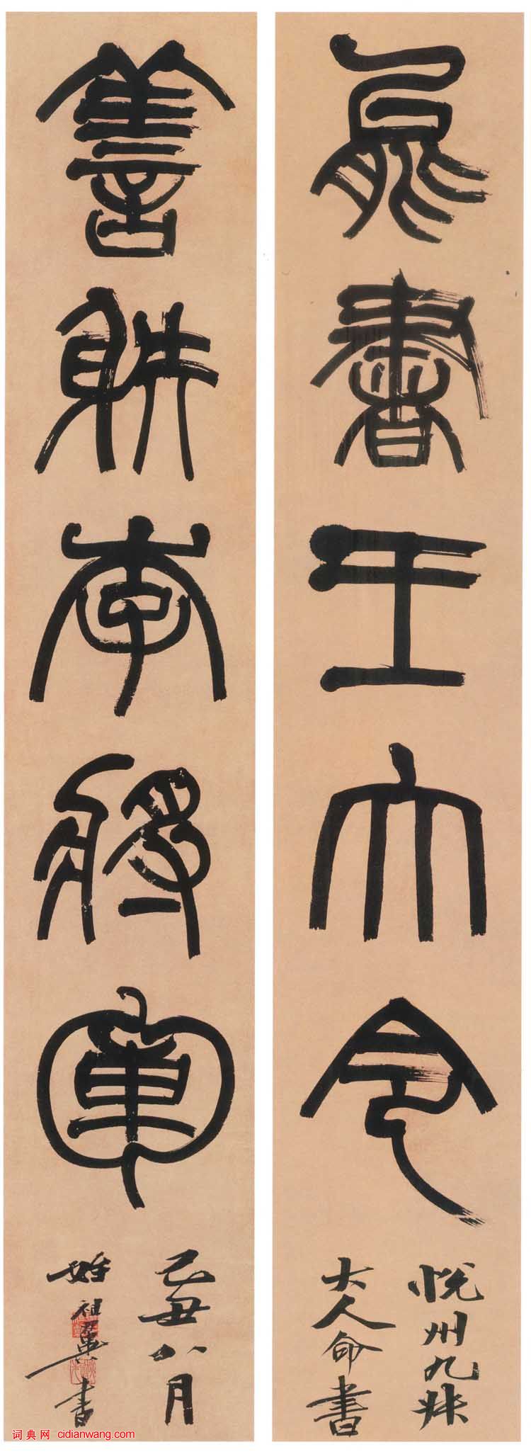 書法欣賞魏晉書法唐朝書法宋朝書法元朝書法明朝書法清朝書法近現代書法字典網>> 歷代書法>> 近現代>> 張祖翼篆書《能書善射五言聯》正文 張祖翼篆書《能書善射五言聯》作者:張祖翼 書體:篆書 張祖翼《篆書能書善射五言聯》紙本篆書 133.5×23.7cm×2 安徽省博物館藏 釋文:能書王大令,善射李將軍。 款署:悅州九叔大人命書,己丑八月姪祖翼書。 鈐印:張祖翼印(白文)、逖先(朱文) 張祖翼的相關書法作品:張祖翼篆書《能書善射五言聯》 張祖翼篆書《能書善射五言聯》 張祖翼隸書《文章懷抱五言聯》 張祖翼《隸書集碑記四條屏》 相關文章:東晉《爨寶子碑》 (隸書)台北故宮博物院藏拓本 爨寶子碑,全稱為“晉故振威將軍建寧太守爨府君墓”碑。乾隆戊...倪元璐《行草書體秋之一五言詩軸》 (行草)倪元璐《行草書體秋之一五言詩軸》紙本行草書 182.6×46.1cm 廣州藝術...金勉《蕪城賦》 (楷書)選自《契蘭堂帖》《蕪城賦》,鮑明達。彌迆平原,南馳蒼梧漲海,北走紫塞雁門。柂以漕...唐寅·自題《李端端圖》 (行書)唐寅《李端端圖》絹本設色 122.7×57.3cm 南京博物院藏鈐印:唐伯虎(...戰國《包山楚簡》 (篆體)戰國中晚期 湖北荊門包山楚簡 湖北省博物館藏(下為局部) 1986年湖北荊門市包...王獻之·餘杭帖 (行書)【釋文】獻之白:思戀,觸事彌至。獻之既欲過餘杭,州將若比還京,必視之。來月十左右...懷素草書《藏真律公二帖》 (草書)懷素草書藏真律公二帖 縱140厘米,橫49厘米 陝西西安碑林 石為豎方形,宋元...孫星衍篆書《非道文而八言聯》 (篆書)孫星衍《篆書非道文而八言聯》紙本篆書 130.4×28.3cm×2 北京故宮...曾熙楷書《遠矚頤神八言聯》 (楷書)曾熙《楷書遠矚頤神八言聯》紙本楷書 202.5×41cm×2 1924年作 ...張宇初·道家識語 (行草)【釋文】清微之謂道中之法也。以其非復天神霄酆岳者比焉。而非功行圓融。心法貫妙者。...