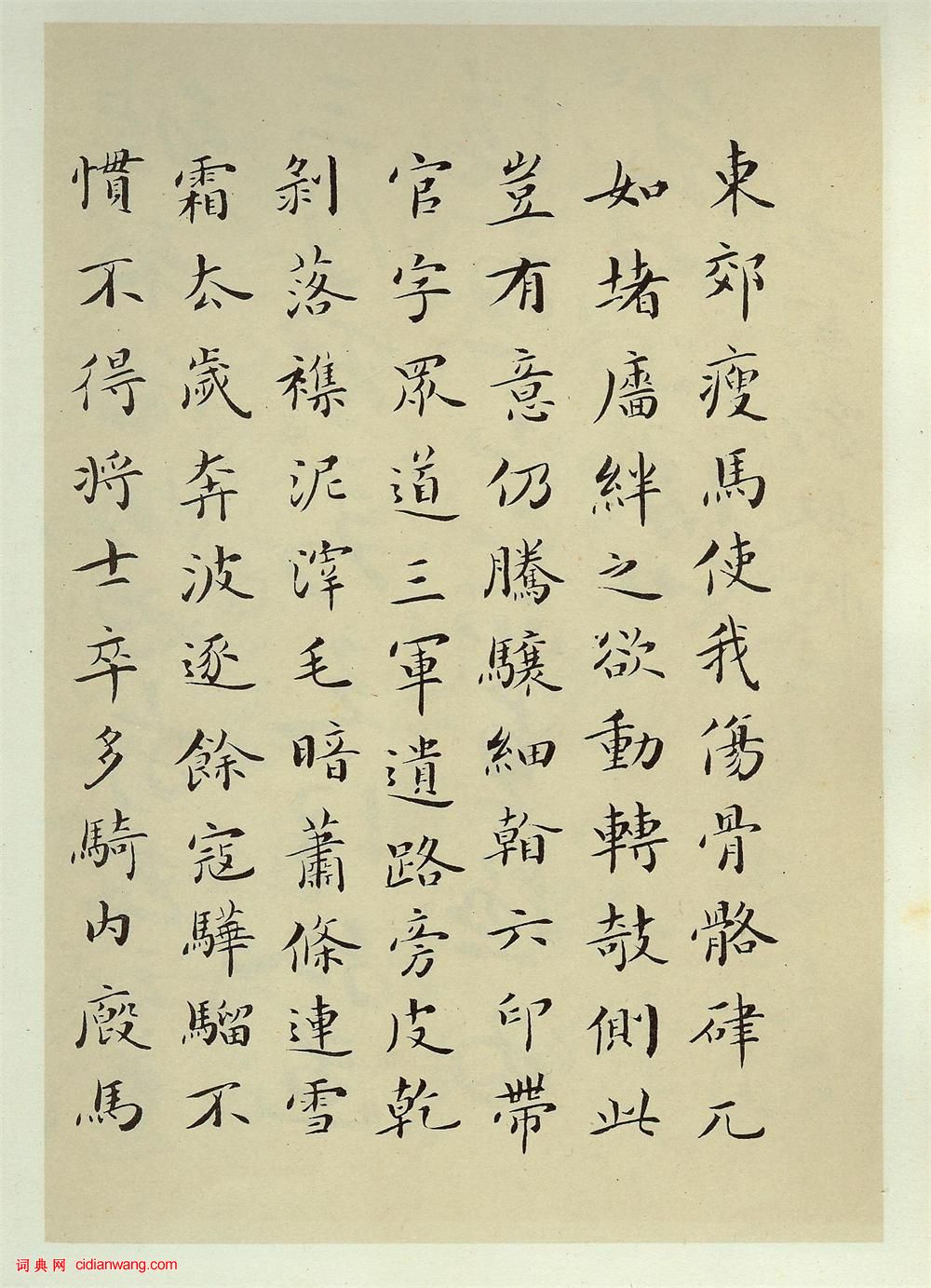 釋文:東郊瘦馬使我傷,骨骼硉兀如堵牆。絆之欲動轉欹側, 此豈有意仍騰驤。細看六印帶官字,眾道三軍遺路旁。 皮乾剝落雜泥滓,毛暗蕭條連雪霜。去歲奔波逐餘寇, 驊騮不慣不得將。士卒多騎內廄馬,惆悵恐是病乘黃。 當時歷塊誤一蹶,委棄非汝能周防。見人慘澹若哀訴, 失主錯莫無晶光。天寒遠放雁為伴,日暮不收烏啄瘡。 誰家且養願終惠,更試明年春草長。