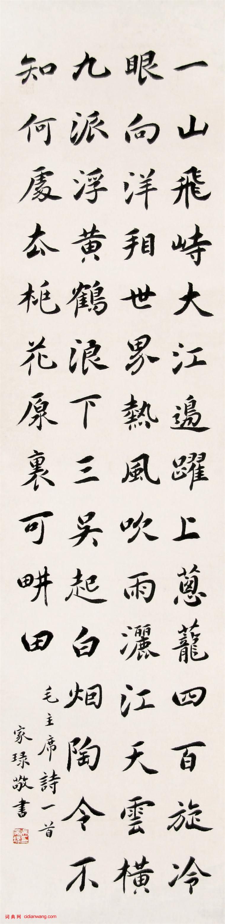 書法欣賞魏晉書法唐朝書法宋朝書法元朝書法明朝書法清朝書法近現代書法字典網>> 歷代書法>> 近現代>> 吳玉如《楷書毛澤東詩軸》正文 吳玉如《楷書毛澤東詩軸》作者:吳玉如 書體:楷書 吳玉如《楷書毛澤東詩軸》 釋文:一山飛峙大江邊,躍上蔥蘢四百鏇。冷眼向洋看世界,熱風吹雨灑江天。雲橫九派浮黃鶴,浪下三吳起白煙。陶令不知何處去,桃花源里可耕田?款識:毛主席詩一首,家琭敬錄。吳玉如的相關書法作品:吳玉如楷書《錄宋方回詩二首扇》 吳玉如《行書札記》 吳玉如小楷《臨樂毅論》 吳玉如楷書《杜甫瘦馬行》 吳玉如行書《錄宋方回詩三首扇》 吳玉如《篆書條幅》 吳玉如《楷書周密點絳唇詞一首》 吳玉如《楷書毛澤東詩軸》 相關文章:王羲之《上虞帖》 (草書)唐摹王羲之草書硬黃本。高23.5厘米,橫26厘米,共七行,五十八字。體勢靈動綽約...東漢隸書《史晨碑》 (隸書)史晨前後碑(日本三井紀念美術館藏本局部) 東漢隸書。此碑為並刻於一石的兩碑。又稱...王時敏隸書《陶淵明詩軸》 (隸書)王時敏《隸書陶淵明詩軸》紙本隸書 111.2×59.5cm 北京故宮博物院藏 ...崔瑗草書《賢女帖》 (草書)崔瑗字子玉,涿郡安平(今屬河北)人。東漢學者、書法家。早孤,鋭志好學,師從賈逵,...張大千罕見的書法手稿 (行草)張大千罕見的書法手稿好稀罕,那個時代的酒店居然有旅客用箋 …大概相當於今天的留言...全國書法大賽展覽作品選多說不如多看,這是真理。看國展獲獎書法家實實在在的作品,對於書法學習者,能夠在臨...米芾《惡札帖》 (行書)【釋文】芾啟,要惡札,是甚字,批及。芾頓首。章侯茂異。米芾《惡札帖》,紙本,行書...葛元喆·跋米友仁《瀟湘奇觀圖》 (楷書)【釋文】米氏父子書畫擅當世,是卷沉著痛快,字如其圖,尤作全也。臨川元喆題。 ...陳洪綬行書《雷鋒塔下畫船少七絕詩》扇面 (行書)陳洪綬《行書雷鋒塔下畫船少七絕詩》扇面 金箋 約順治二年(約1645)上海博物館...張祖翼《隸書集碑記四條屏》 (隸書)張祖翼《隸書集碑記四條屏》紙本隸書 133×29cm×4 常州市博物館藏。款...
