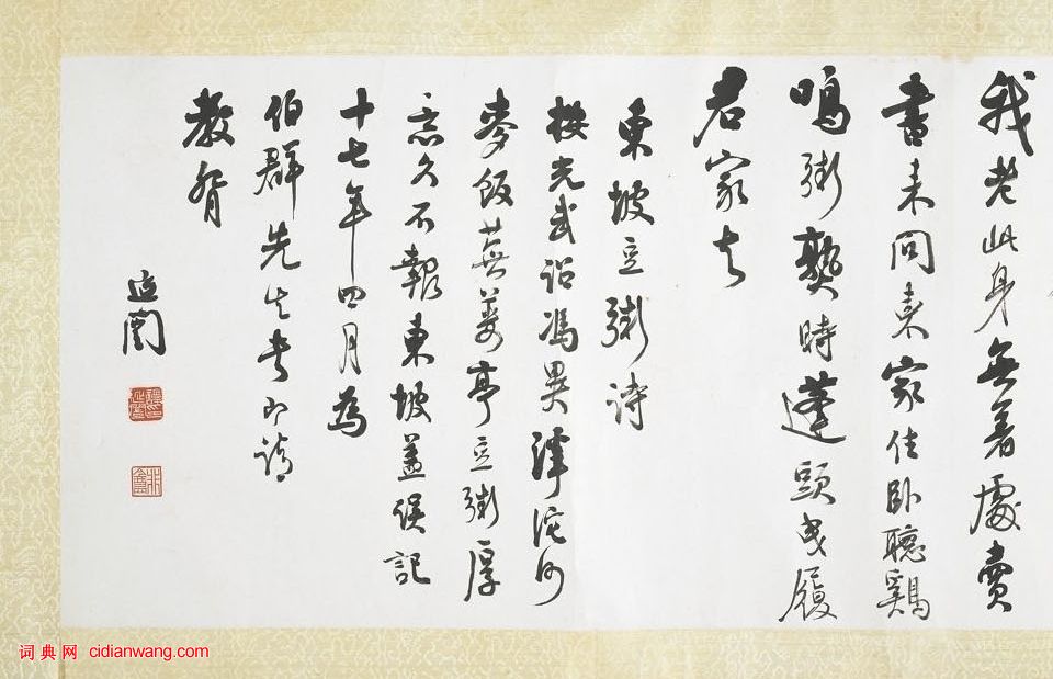 款識:東坡豆粥詩。按光武詔。馮異譚沱何麥飯蕪姜亭豆粥厚意。久不報。東坡蓋誤記。十七年四月為伯群先生。專即請教腕。延闓。