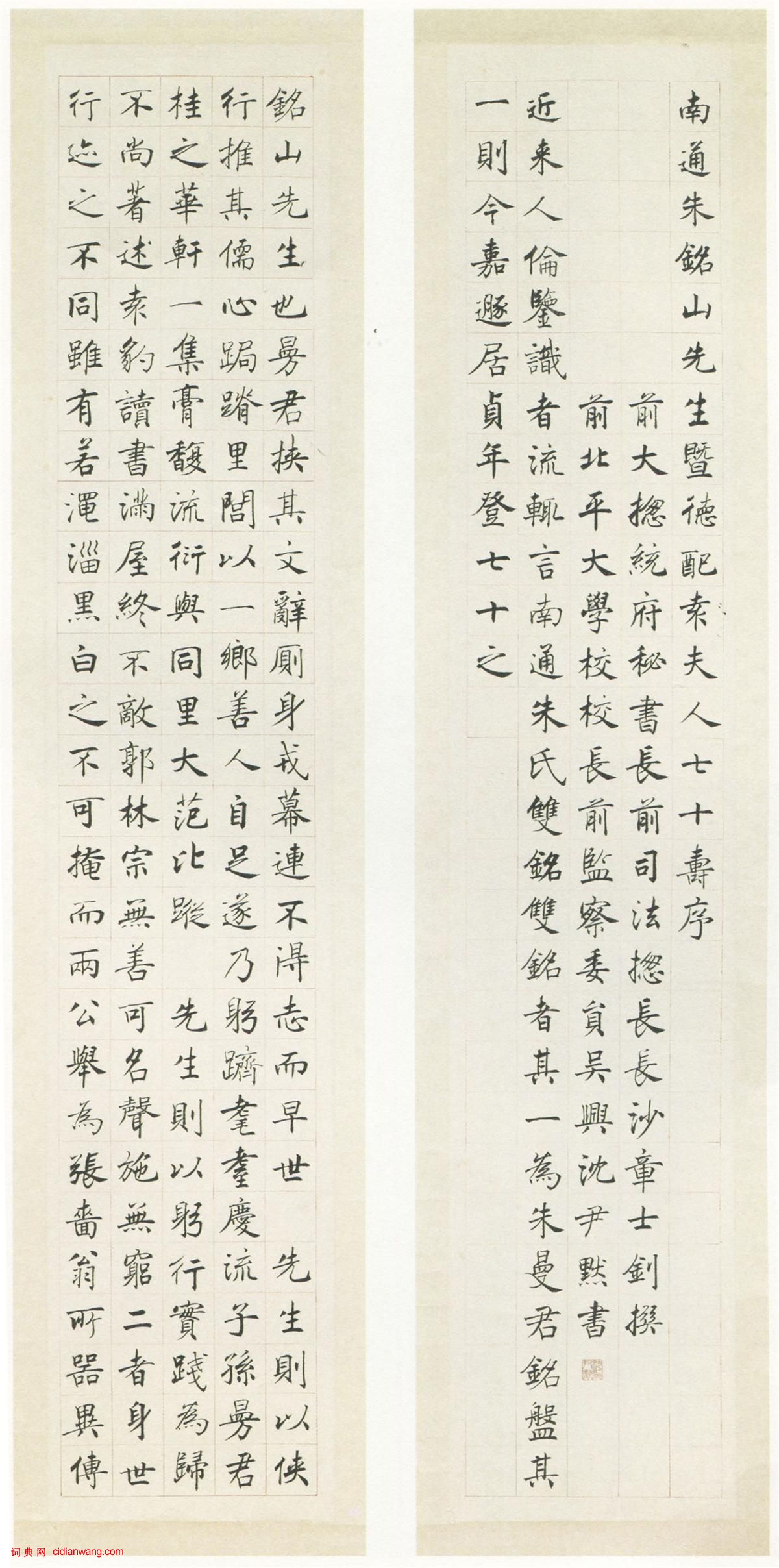 南通朱銘山先生暨德配袁夫人七十壽序。前大總統府秘書長前司法總長長沙章士釗撰。前北平大學校校長前監察委員吳興沈尹默書。近來人倫鑒識者流,輒言南通朱氏雙銘。雙銘者,其一為朱曼君銘盤,其一則今嘉遯居貞年登七十之銘山先生也。曼君挾其文辭,厠身戎幕,連不得志而早世。先生則以俠行,推其儒心,跼蹐里閭,以一鄉善人自足,遂乃躬躋耄耋,慶流子孫。曼君桂之華軒,一集膏馥,流衍與同里,大范比蹤。先生則以躬行實踐為歸,不尚著述,袁豹讀書滿屋,終不敵郭林宗,無善可名,聲施無窮。二者身世行跡之不同,雖有若澠淄黑白之不可掩,而兩公舉為張嗇翁所器。異傳雲,名譽不彰,朋友之過。自來知人之哲,先親其友。尋嗇翁與曼君里閈既同,年輩相若,文章氣誼,無一不近,其得相與為友,高颺通州,三君之幟,天下類能言之。獨嗇翁鋭跡華膴,投身貨利,其取徑全異帖括聲病之為,而又年事漸高,舊交零落,所為揮斥肆應之方,在在虞其捍格於斯,非有艱苦卓絕,儒名墨實,其人為之奔走先後,其且功不必成,成亦立隳也。似理勢之所難違。元二之間,通州對江各縣,沙灘淤漲,江水衝刷北岸,日見坍削。嗇翁憂之,為起築楗保坍諸工程。先生固精生事,於材木之業,有深識。至是,嗇翁加意禮羅,倩其出肩艱鉅,先生亦自以鄉里之事,責無可貰。凡糾工庀材,一切之計,絕不以勞怨介意,獨力任之。此南通大事,為嗇翁所利賴,而亦先生靖獻地方公益之嚆失。昔漢之循吏名信臣龔遂輩,以使民致富為第一義,如令口種一樹榆、百本薤、五十本蔥、一畦韭,家二母彘、五雞,是惟嗇翁之治通州亦然。當日勃海之榆、薤、彘、雞,通州則一之於紡績。先生佐嗇翁,持是筞,家庭率先行之。德配袁夫人,以名門之子,為隱居之婦。懿德勤行,鄉國交推,遂乃紗曝於庭,機鳴於室,一門摻作,與里中細民,一無差異。至今通州民無失業,行道不見丐者,比於史公稱勃海郡中,皆有畜積,吏民皆富實,何以加茲。凡此見嗇翁之遺澤,亦先生夫婦之績效雲。四十年來,吾游江海,平接人物,一行之善,輒不敢忘。禦侮軍興,西州尤為才器淵藪,吾於圜府,見有恂恂少年,不茍言笑,輝光呈露,源於篤實,為神往者久之。既知為先生之少君慎微,而得納交。常從慎微,徵叩先生之平生行事,益信德門光大之非偶然,並嘆古人箕裘之業,殊不必趨於一致。歲丁亥十月七日,為先生七十覽揆之辰。慎微隨其兄瑞元子野輩精誠乃心崇節其儀捧觴為雙親致祝禮也同人相率揚觶推士釗前席而為之頌又何敢辭爰述南通朱氏連誼之大及名父子行誼之最卓犖者如右簡。吳敬恆、居正、程潛、邵力子、吳鐵城、薛岳、白崇禧、錢大鈞、胡適、吳國楨、仇鰲、錢永銘、杜鏞、陳其采、陳布雷、陳立夫、朱家驊、潘公展、趙恆惕、唐生智、何鍵、吳奇偉、賀耀祖、朱經農、俞鴻鈞、張嘉璈、蔣廷黻、王懋功、張道藩、方治、楊虎、宣鐵吾、李及蘭、范紹增、宋漢章、徐寄廎、王曉籟、秦潤卿、吳蘊初、陳行、李銘、劉攻芸、陳霆銳、奚玉書、江一平、傅汝霖、李揚敬、曾養甫、程中行、廬前、狄膺、毛慶祥、魯蕩平、趙棣華、劉航琛、顧翊羣、潘序倫、徐伯園、李儻、余籍傳、李鋭、程遠帆、謝霖、楊銳靈、霍寶樹、葛覃、楊綿仲、龔學遂、趙志垚、周雍能、戴銘禮、董轍、董贊堯、吳興周、張鏡予、方東、吳任滄、谷春帆、吳紹澍、謝仁釗、沈宗濂、吳開先、趙祖康、趙曾玨、祝平、田永謙、俞叔平、李熙謀、張維、張曉崧、閔湘帆、朱虛白、鄭天牧、馮世範、歐陽遵詮、張宗孟、王兆荃、王冠青、謝灝齡、葛克信、陶一珊、黃慕宗、黃祖培、時壽彰、余愷湛、雍家源、章益、沈亦珍、盧豐年、歐震、丘國維、容有畧、許葆英、浦拯東、奚倫、俞佐廷、王延松、楊蔭溥、李道南、王庸、沈熙瑞、范鶴言、高方、林崇墉、陳希誠、王志莘、駱清華、彭湖、胡惠春、周煒方、許寶驊、徐義衡、顧竹淇、方興、陳忱、陳方修、杜維藩、邊定遠、陸京士、唐承宗、徐懋棠、潘樹藩、丁子馨、沈鈁、潘世傑、張禹聲、徐同熙、劉孟韓等載拜敬祝。中華民國三十六年,歲次丁亥十月 穀旦。