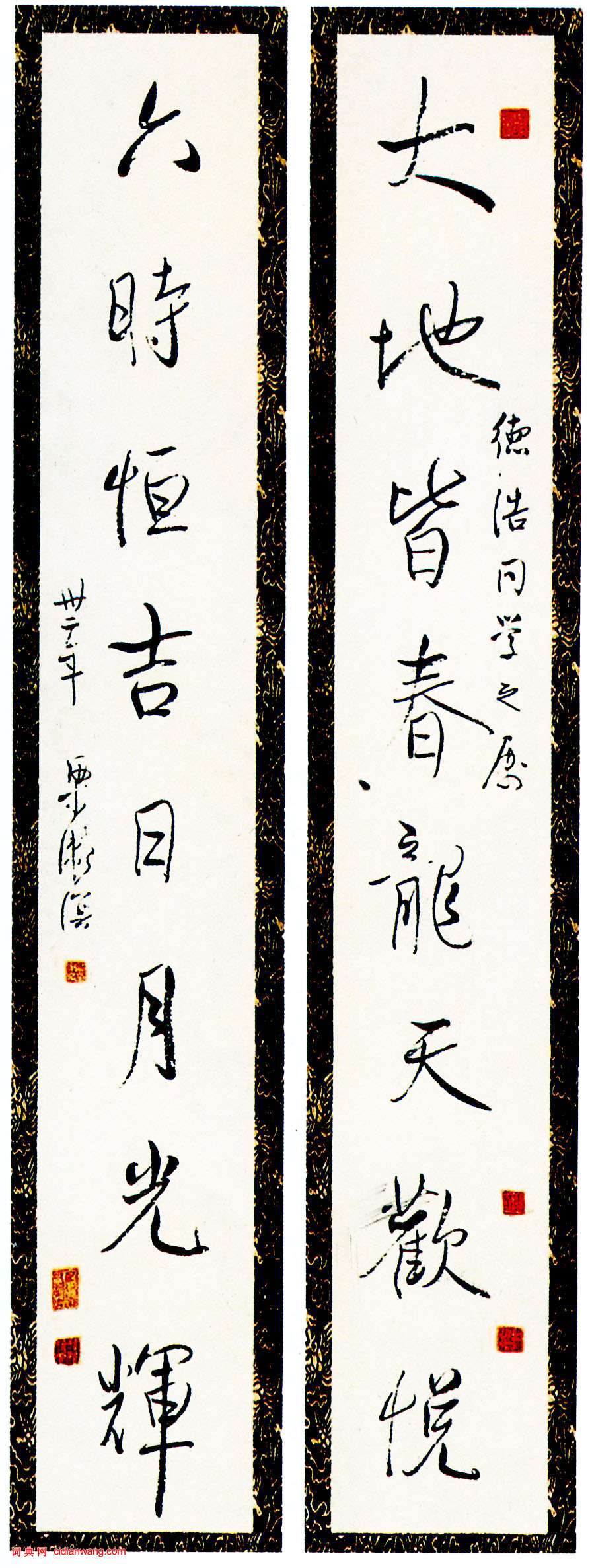 書法欣賞魏晉書法唐朝書法宋朝書法元朝書法明朝書法清朝書法近現代書法字典網>> 歷代書法>> 近現代>> 梁漱溟《行書大地六時八言聯》正文 梁漱溟《行書大地六時八言聯》作者:梁漱溟 書體:行書 梁漱溟《行書大地六時八言聯》行書 1943年釋文:大地皆春龍天歡悅,六時恆吉日月光輝圖文來自《梁漱溟先生手跡選》(世界圖書出版公司出版 梁培寬編) 梁漱溟的相關書法作品:梁漱溟行書《錄陶淵明詩句》 梁漱溟行書《錄林宰平詩一首》 梁漱溟《行書大地六時八言聯》 梁漱溟行書《錄陸游詩句》 梁漱溟行書 《錄朱熹詩一首》 梁漱溟行書《守之以道行其所知四言聯》 梁漱溟行書《錄解深密經文句》 梁漱溟《我的自學小史手稿選頁》 相關文章:蘇軾《寒食帖》,蘇軾黃州寒食帖 (行書)《寒食帖》又名《黃州寒食詩帖》或《黃州寒食帖》。是蘇軾撰詩並書,墨跡素箋本,橫3...梁巘《行草論書軸》 (行草)梁巘《行草論書軸》紙本行草書 104×51cm 安徽省博物館藏。 《行草論書軸...張駿·草書杜甫貧交行 (草書)【釋文】翻手作雲覆手雨,紛紛輕薄何須數。君不見管鮑貧時交,此道今人棄如土。右杜子...南朝楷書《爨龍顏碑》 (楷書)在雲南陸良彩色沙林西面約二三公里的薛官堡斗閣寺大殿內,聳立著一塊古碑,這就是全國...歐陽詢《夢奠帖》 (行書)【釋文】仲尼夢奠,七十有二。周王九齡,具不滿百。彭祖資以導養,樊重任性,裁過盈數...溫革行書《跋黃庭堅緻景道十七使君尺牘》 (行書)溫革《跋黃庭堅緻景道十七使君尺牘》行書,台北故宮博物院藏釋文:革頃與德麟遊。頗聞...宋人書法真不簡單 (行草)宋代書法,承唐繼晉,上技五代,開創了一代新風。宋太宗時留意書法翰墨,購摹古先帝王...王羲之行書《先墓帖》2種 (行書)王羲之行書《先墓帖》書法拓本2種先墓帖釋文:舊京先墓毀動,奉諱號慟,五內若割,痛...張駿·行書手札 (行書)張駿《手札》,北京故宮博物院藏。刊於《中國書法》雜誌1991年第一期(贈頁)。王羲之《用筆賦》及釋文王羲之的《用筆賦》原文:秦、漢、魏至今,隸書其惟鍾繇,草有黃綺、張芝,至於用筆神...