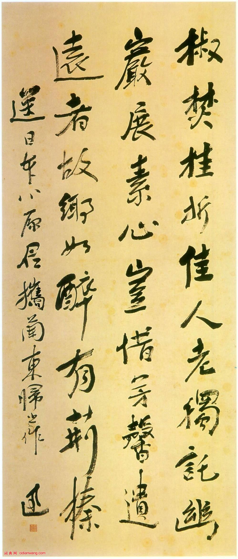 書法欣賞魏晉書法唐朝書法宋朝書法元朝書法明朝書法清朝書法近現代書法字典網>> 歷代書法>> 近現代>> 魯迅行書《送O.E.君攜蘭歸國》正文 魯迅行書《送O.E.君攜蘭歸國》作者:魯迅 書體:行書 魯迅 《送O.E.君攜蘭歸國》 183×56.4cm 1931年 上海魯迅紀念館藏釋文:椒焚桂折佳人老,獨托幽岩展素心。豈惜芳馨遺遠者,故鄉如醉有荊榛。 送日本小原君攜蘭東歸之作 迅魯迅的相關書法作品:魯迅《行書悼楊銓詩》 魯迅行書《錄老子語贈長尾景和軸》 魯迅行書《贈岡本繁自題小像》 魯迅《錄司馬相如大人賦贈章矛塵孫斐君》 魯迅行書《韋素園墓記》 魯迅行書《贈坪井先生答客誚》軸 魯迅行書《錄歐陽炯南鄉子詞軸》 魯迅行書《贈瞿秋白先生聯》 魯迅行書《贈郁達夫答客誚》軸 相關文章:東漢隸書《尹宙碑》 (隸書)《尹宙碑》全稱《 漢故豫州從事尹府君銘 》。東漢隸書碑刻。篆額已殘,止存從、銘兩...翁方綱《隸書池上竹間七言聯》 (隸書)翁方綱《隸書池上竹間七言聯》紙本隸書 124×25.5cm×2 瀋陽故宮博物...祝允明《楷書千字文》 (楷書)此冊乃祝允明三十六歲時應朱凱(字堯民)所書。朱凱(?-1514),長洲(今蘇州)...倪瓚小楷《題周文英詩志傳》 (小楷)倪瓚小楷《題周文英詩志傳》 1372年 縱25.9厘米 橫26.2厘米 遼寧省博...柳公權楷書《復東林寺碑》 (楷書)柳公權《復東林寺碑》 楷書 唐大中十一年(857)崔黯撰文, 石在江西廬山。東林...趙之謙《書畫扇面合景軸——隸書扇面》 (隸書)趙之謙《書畫扇面合景軸——隸書扇面》絹本 直徑23cm 浙江省博物館藏 釋文:夙...趙之謙的團扇書法,漂亮極了 (行書)趙之謙浙江紹興人。初字益甫,號冷君;後改字撝叔,號悲庵、梅庵、無悶等。青年時代即...西漢隸書《銀雀山漢簡》 (隸書)《銀雀山漢簡》 《銀雀山漢簡》於一九七二年四月間在山東臨沂銀雀山的兩座前漢墓中出...張瑞圖《行書獨嘯層岩第一峰詩》 (行書)張瑞圖《行書獨嘯層岩第一峰詩》軸 絹本 188×53厘米 年代不詳 英國大英...來楚生行書《錄黃庭堅句七言聯》 (行書)來楚生《錄黃庭堅句七言聯》紙本(汁綠虎皮宣)行書 103×18.5cm×2 ...