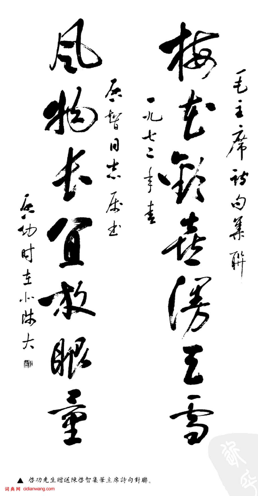 書法欣賞魏晉書法唐朝書法宋朝書法元朝書法明朝書法清朝書法近現代書法字典網>> 歷代書法>> 近現代>> 啟功行草《毛主席詩句對聯》正文 啟功行草《毛主席詩句對聯》作者:啟功 書體:行草 啟功1972年贈送陳啟智行草《毛主席詩句對聯》。釋文:梅花歡喜漫天雪,風物長宜放眼量啟功的相關書法作品:啟功先生《自撰墓志銘》 啟功行書題簽欣賞 啟功先生書法動態運筆圖 9對啟功對聯欣賞 啟功行書《自作詩九首》 啟功《行書七言對聯》 啟功行草《毛主席詩句對聯》 啟功小楷《失眠口占小品》 啟功草書《千字文》 相關文章:詹景鳳草書《杜甫詩軸》 (草書)詹景鳳《草書杜甫詩軸》 紙本草書 165.2×82.3cm 吉林省博物館藏釋文...何紹基楷書《為樂去古八言聯》 (楷書)何紹基《楷書“為樂去古”八言聯》釋文:為樂及時令德無極,去古不遠直道在斯。蝯叟。...黃道周楷書《王忠文祠碑文》 (小楷)黃道周《王忠文祠碑文》紙本楷書(局部)30×261.5cm 廣東省博物館藏 ...顏真卿行書《祭伯父文稿》 (行書)顏真卿《祭伯父文稿》宋甲秀堂拓本 北京故宮博物院藏又稱《告伯父文稿》,全稱《祭伯...米芾草書《論草書帖》 (草書)米芾 《論草書帖》 紙本 草書 縱24.7厘米 橫37厘米 台北故宮博物院藏 米...陳融《草書詩軸》 (草書)陳融《草書詩軸》,紙本,澳門博物館藏。釋文:冷落東風萬柳絲,銷魂橋上立多時。酒痕...申時行《行草七律詩扇》 (行草)申時行《行草七律詩扇》 19.4×55cm 蘇州博物館藏釋文:石磴縈紆翠壑重,...薛紹彭《大年帖》書法 (草書)【釋文】紹彭啟:多日廷中不得少款為慊。晴和,想起居佳安。二畫久假,上還,希檢收。...周亮工《七言絕句軸》 (·行書)周亮工《行書七言絕句軸》,紙本。南京博物院藏。米芾親手示範:行書有規律行書,是書法藝術中,最常見的書體。行書風格多樣,就結構來說,各種風格的行書有其個...