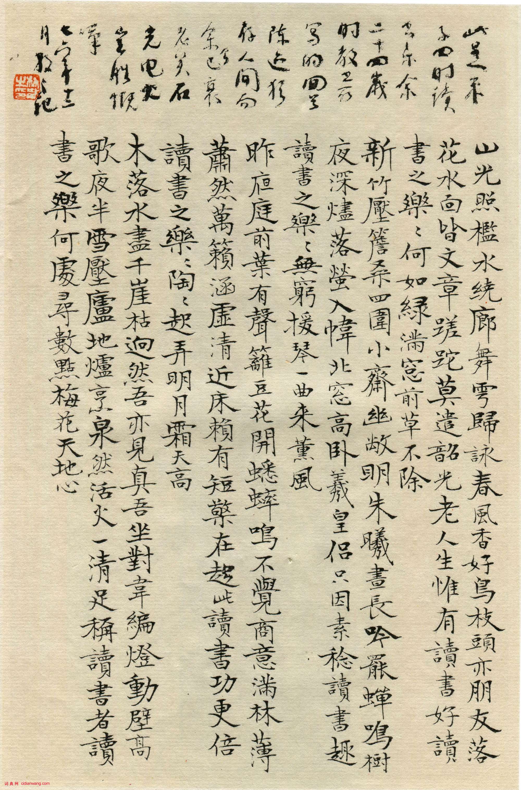 山光照檻水繞廊,舞雩歸詠春風香。 好鳥枝頭亦朋友,落花水面皆文章。 蹉跎莫遣韶光老,人生惟有讀書好。 讀書之樂樂何如,綠滿窗前草不除。