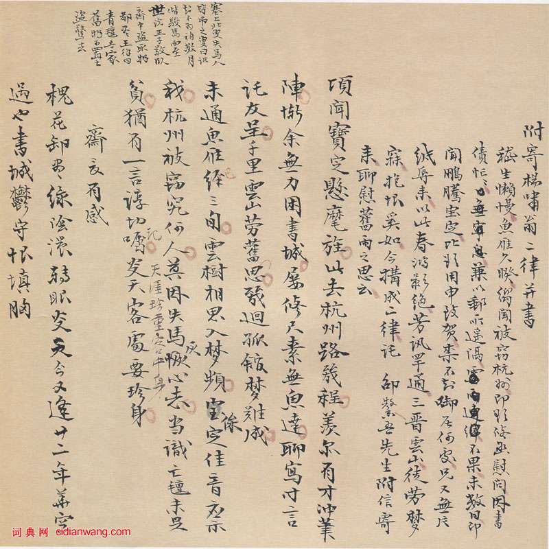 書法欣賞魏晉書法唐朝書法宋朝書法元朝書法明朝書法清朝書法近現代書法字典網>> 歷代書法>> 近現代>> 林散之《自作詩附寄楊嘯翁二律並書》正文 林散之《自作詩附寄楊嘯翁二律並書》作者:林散之 書體:行書 林散之《自作詩附寄楊嘯翁二律並書》 1914年 釋文: 款署:甲寅九月十三午時,林霖。 【資料來源】《林散之書畫集》(文物出版社)1 2 3 下一頁 尾 頁林散之的相關書法作品:林散之《隸書俾壽八言聯之一》 林散之《楷書節錄智果書頌》 林散之行書《舉杯嚼雪五言聯》 林散之行書《友天下士四言聯》 林散之《行書小雨長江七言聯》 林散之《自作詩附寄楊嘯翁二律並書》 林散之談書法,如何脫俗 林散之《隸書世界人間八言聯》 林散之行書《酒逢禮愛五言聯句》 相關文章:吳昌碩篆書《小圃瀞流七言聯》 (篆書)吳昌碩《篆書七言聯》 紙本,1920年作 115×26cm×2 來自西泠拍賣...懷素草書《聖母帖》卷宋拓,八大山人藏 (草書)八大山人藏宋拓聖母帖卷 絹本,無年款。縱二九·五厘米,橫二三九厘米。鈐印三方:...魯迅行書《錄辛亥殘秋偶作贈許壽裳軸》 (行書)魯迅 《錄辛亥殘秋偶作贈許壽裳軸》 81×45.5cm 1935年 北京魯迅紀...莫友芝《篆書龢神春雲八言聯》 (篆書)莫友芝《篆書龢神春雲八言聯》紙本篆書 126.2×32.6cm×2 北京故宮...翁同龢楷書《守獨辭高八言聯》 (楷書)翁同龢《楷書守獨辭高八言聯》紙本楷書 171.2×33.8cm×2 台北故宮...文徵明行書《明妃曲》 (行書)他是書法史上數得著的大家,以嚴謹精緻、飄逸秀麗見長。耄耋之年,筆下依然一筆不苟。...虞集行書《致丹丘博士公尺牘》 (行書)虞集《致丹丘博士公尺牘》(又稱《不及入閣帖》)紙本行書 21×37.7cm ...陳奕禧《行書詩卷》 (行書)陳奕禧《行書詩卷》,香港藝術館虛白齋藏。黃庭堅行書《題王詵詩帖》 (行書)黃庭堅《題王詵詩帖》 紙本行書 29.2×22.3cm 北京故宮博物院藏 ...褚遂良·大字陰符經 (楷書)“大字陰符經”墨跡本,96行,461字,傳唐代褚遂良書。世傳褚遂良楷書有“雁塔聖...
