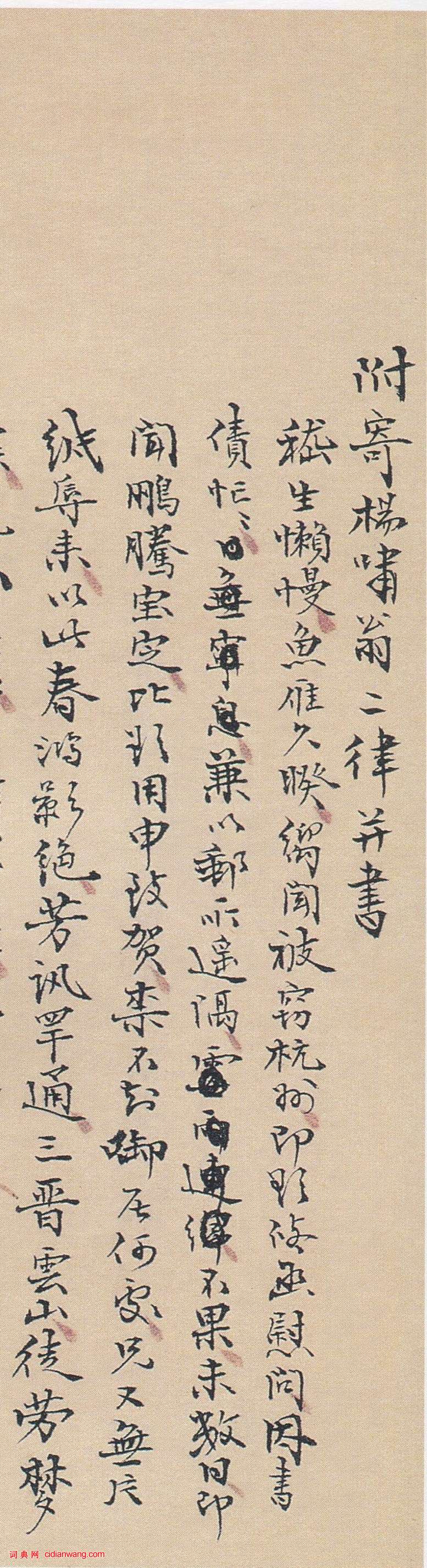 書法欣賞魏晉書法唐朝書法宋朝書法元朝書法明朝書法清朝書法近現代書法字典網>> 歷代書法>> 近現代>> 林散之《自作詩附寄楊嘯翁二律並書》(2)正文 林散之《自作詩附寄楊嘯翁二律並書》(2)作者:林散之 書體:行書 首 頁 上一頁 1 2 3 下一頁 尾 頁林散之的相關書法作品:林散之行草《酒逢禮愛五言聯句》 林散之楷書《書贈日本詩軸》 林散之行書《舉杯嚼雪五言聯》 林散之《草書作畫有感二首詩軸》 林散之行書《酒逢禮愛五言聯句》 林散之跋黃賓虹《黃山臥遊》 林散之草書《瑤池歸來自作詩軸》 林散之隸書《以義乃台八言聯》 林散之《隸書釋智果書頌橫幅》 相關文章:釋東皋妙聲楷書《東坡先生像贊》 (楷書)蘇軾《治平帖》卷引首有明人所畫蘇軾像及釋東皋妙聲所書《東坡先生像贊》。釋文:岷山...文徵明行草《千字文》 (行草)文徵明行草書法欣賞《千字文》,書於嘉靖乙巳(1545年)八月十日,時文徵明76歲...董其昌·跋米友仁《瀟湘奇觀圖》 (行書)董其昌跋米友仁《瀟湘奇觀圖》,行書,縱19.8cm,故宮博物館藏。題跋前後共分三...王羲之·快雪時晴帖 (行書)【釋文】羲之頓首。快雪時晴。佳想安善。未果為結。力不次。王羲之頓首。山陰張侯。《...黃輝《行書棧閣雜詩卷》 (行書)黃輝《行書棧閣雜詩卷》紙本行書 30.5×566cm 北京故宮博物院藏 釋文:...文徵明小楷《老子列傳》 (小楷)文徵明小楷《老子列傳》該作作於68歲,《老子列傳》凡34行,書於明世宗嘉靖十七年...吳榮光行書《致晴圃書札》 (行書)吳榮光行書《致晴圃書札》 釋文:晴圃五兄大人閣下:自榮光伏處鄉里,一緘布及,心領...紀曉嵐書法欣賞 (行書)紀曉嵐字潤飽滿,鏗鏘有力。紀曉嵐書法作品,受當時書法風格影響,有著圓融,雍容華貴...魏碑《元楨墓誌》 (楷書)《元楨墓誌》是元魏宗子志石時間最古的。刻於魏孝文帝太和二十年(公元496年),是...胡儼《題洪崖山房圖》 (行書)【釋文】憶著洪崖三十年,青青山色故依然。當時洞口逢張氳,何處人間有傅顛。陰瀑倚風...