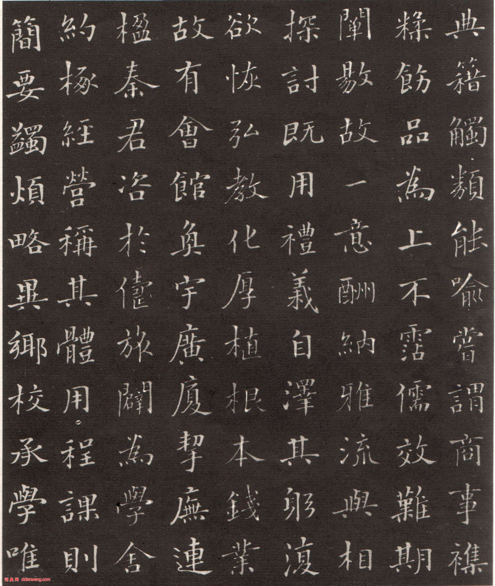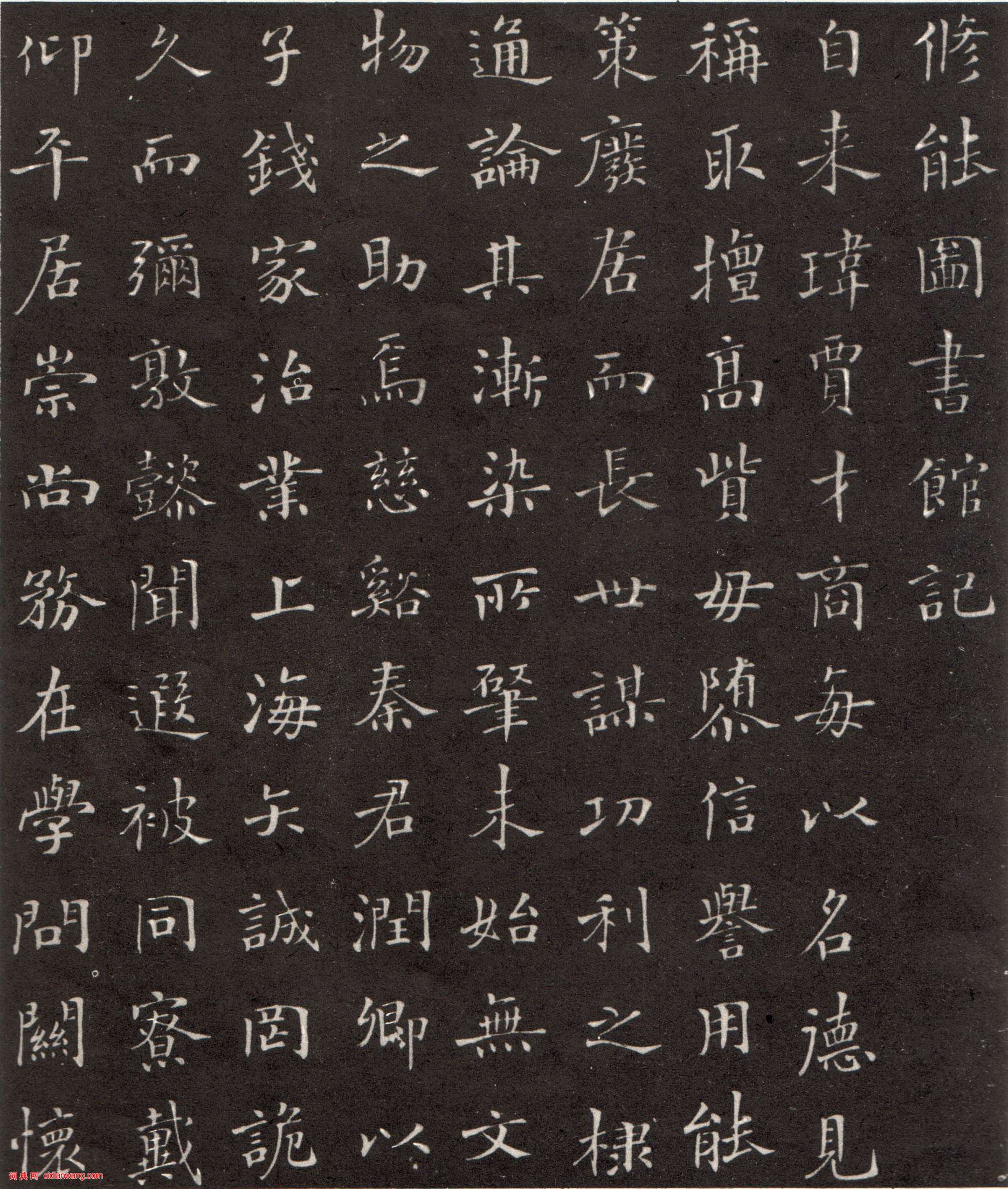 沙孟海,擅篆、隸、行、草、楷諸書,偏愛書法的“體勢”和章法的“氣勢”,所作榜書大字,雄渾剛健,氣勢磅礴。他的楷書,也很有氣勢。如1947年他48歲所作《修能圖書館記》,既是他中年時期楷書的優秀作品,也是其得意之作。