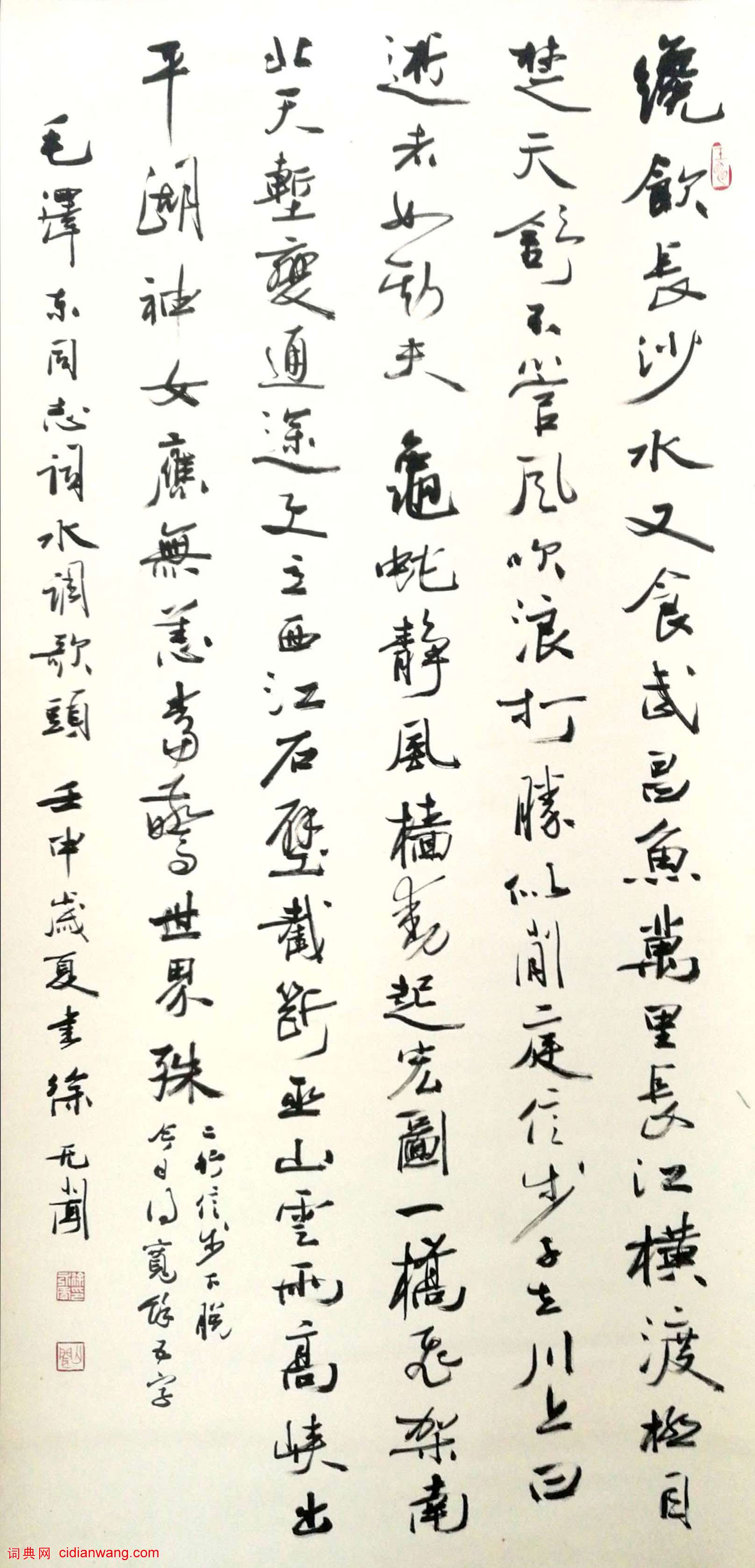 釋文:才飲長沙水,又食武昌魚。萬里長江橫渡,極目楚天舒。不管風吹浪打,勝似閒庭信步,子在川上曰:逝者如斯夫!